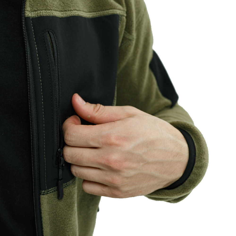 Кофта мужская Composite Gen 4 Khaki изготовлена из флиса (100% полиэстер), хорошо держит тепло и является практичной верхней одеждой в демисезонный период. Отличием от предыдущих версий изделия в новой модели нагрудный карман расположен с другой стороны, а также предусмотрены на обеих рукавах панели для крепления нашивок, патчей. Также материал более плотный.
