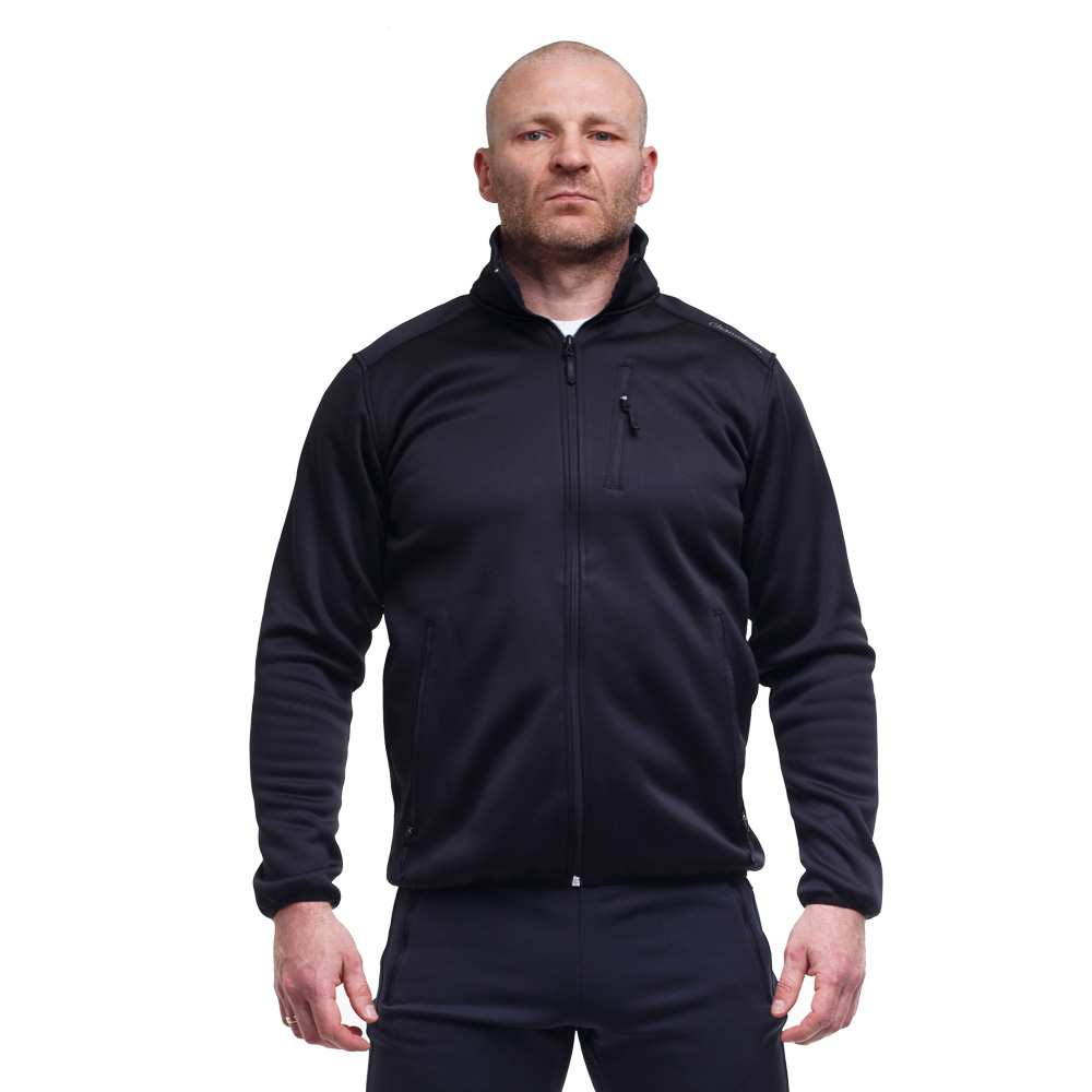 Крой кофты в меру свободный, застегивается по всей длине на прочную и надежную молнию YKK. Низ с нерегулируемой эластичной утяжкой с занижением по спине. Воротник стойка средней высоты. Рукав среднего объёма с нерегулируемым эластичным манжетом.