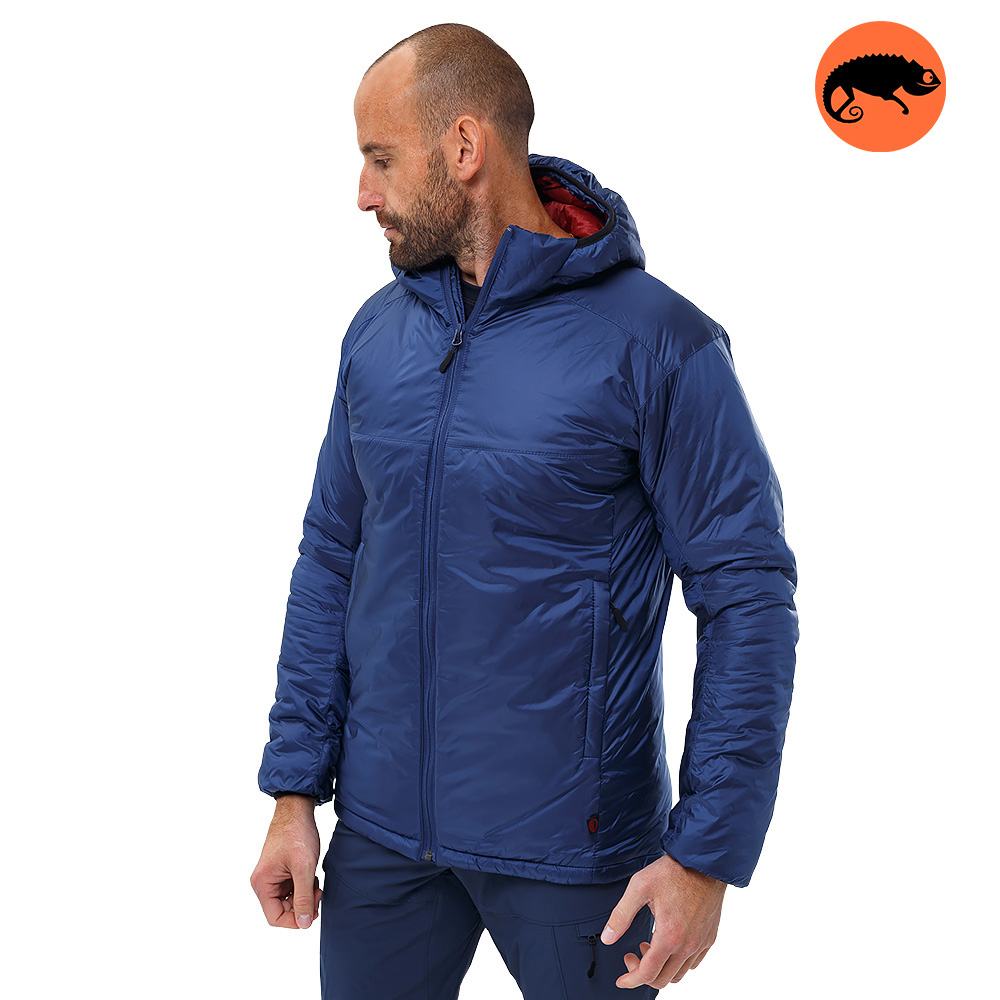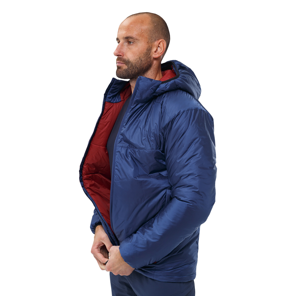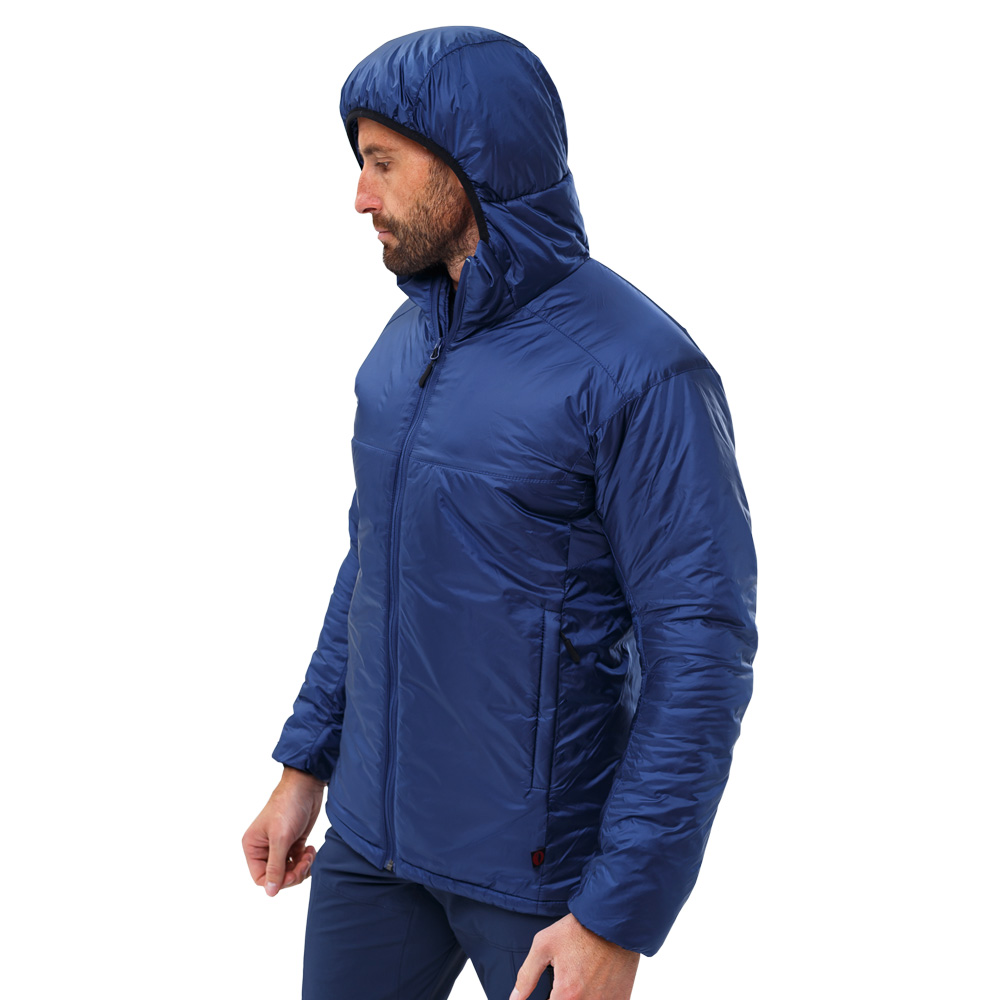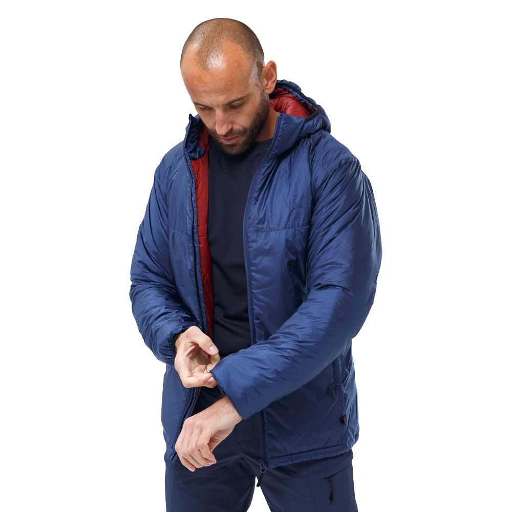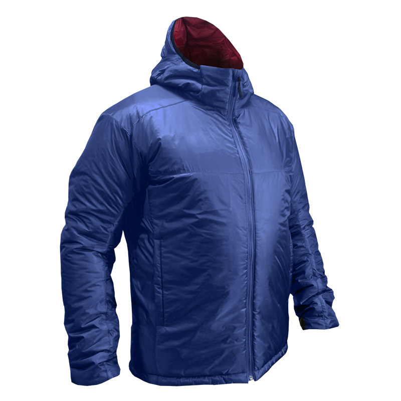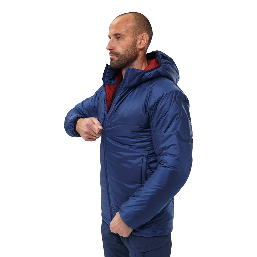 Cиняя зимняя мужская куртка Dufour Indigo с центральной застежкой на молнии и яркой бордовой подкладкой. Изделие подойдет для ветренной погоды и моросящего дождя или мелкого снега. Температура комфорта до -15°C.