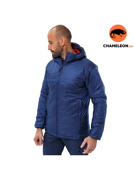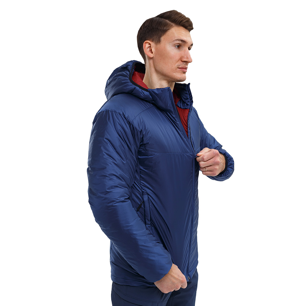 Cиняя зимняя мужская куртка Dufour Indigo с центральной застежкой на молнии и яркой бордовой подкладкой. Изделие подойдет для ветренной погоды и моросящего дождя или мелкого снега. Температура комфорта до -15°C.