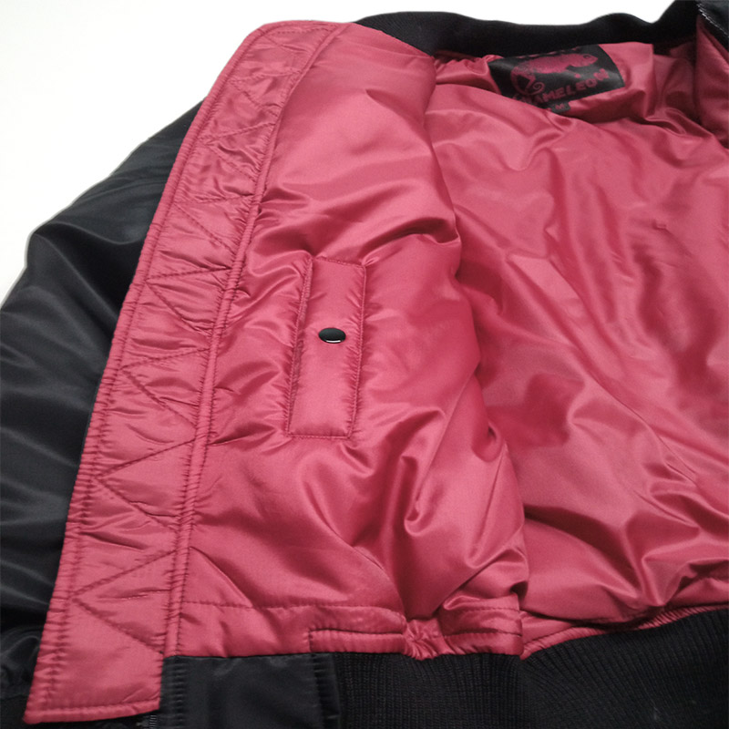 Внутри куртки MA-1 яркая подкладка из 100 % бордового полиэстера, плотность 70 г/м2. Такая подкладка была не только элементом дизайна, но и функциональной частью куртки и была создана для повышения видимости и быстрого нахождения пилотов в чрезвычайных ситуациях.
