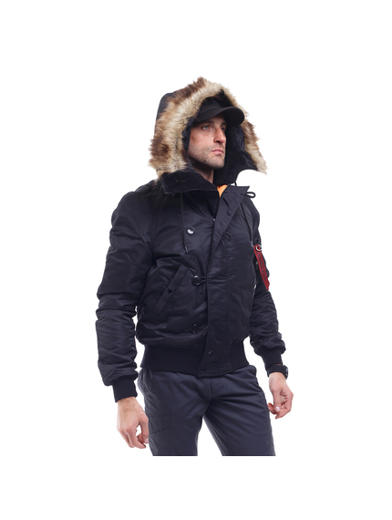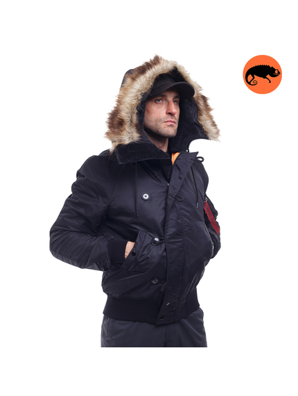 Зимний бомбер N-2B Slim Black зауженного кроя со сноркель капюшоном и яркой оранжевой подкладкой. Капюшон на куртке не отстегивается. Мех на капюшоне не отстегивается. Посередине капюшона присутствует молния, которая разделяет его на две части.