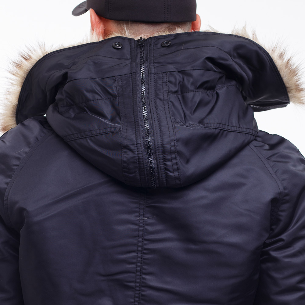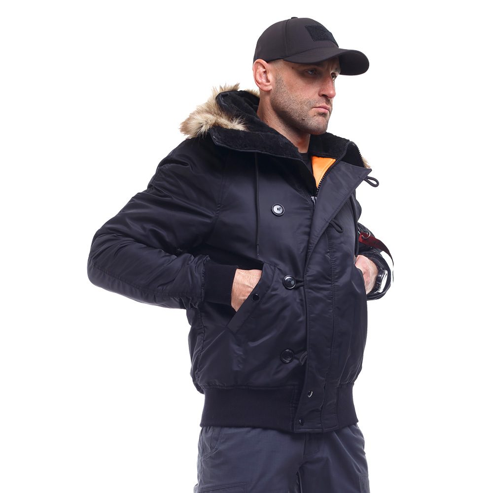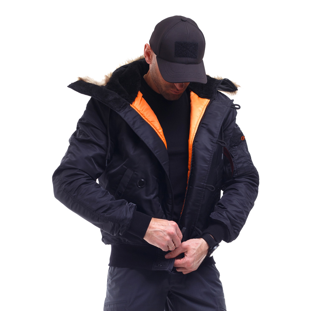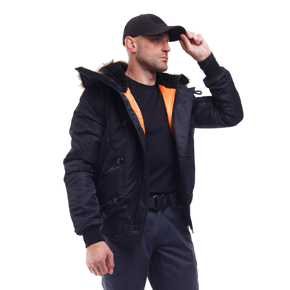 Зимний бомбер N-2B Slim Black зауженного кроя со сноркель капюшоном и яркой оранжевой подкладкой. Капюшон на куртке не отстегивается. Мех на капюшоне не отстегивается. Посередине капюшона присутствует молния, которая разделяет его на две части.
