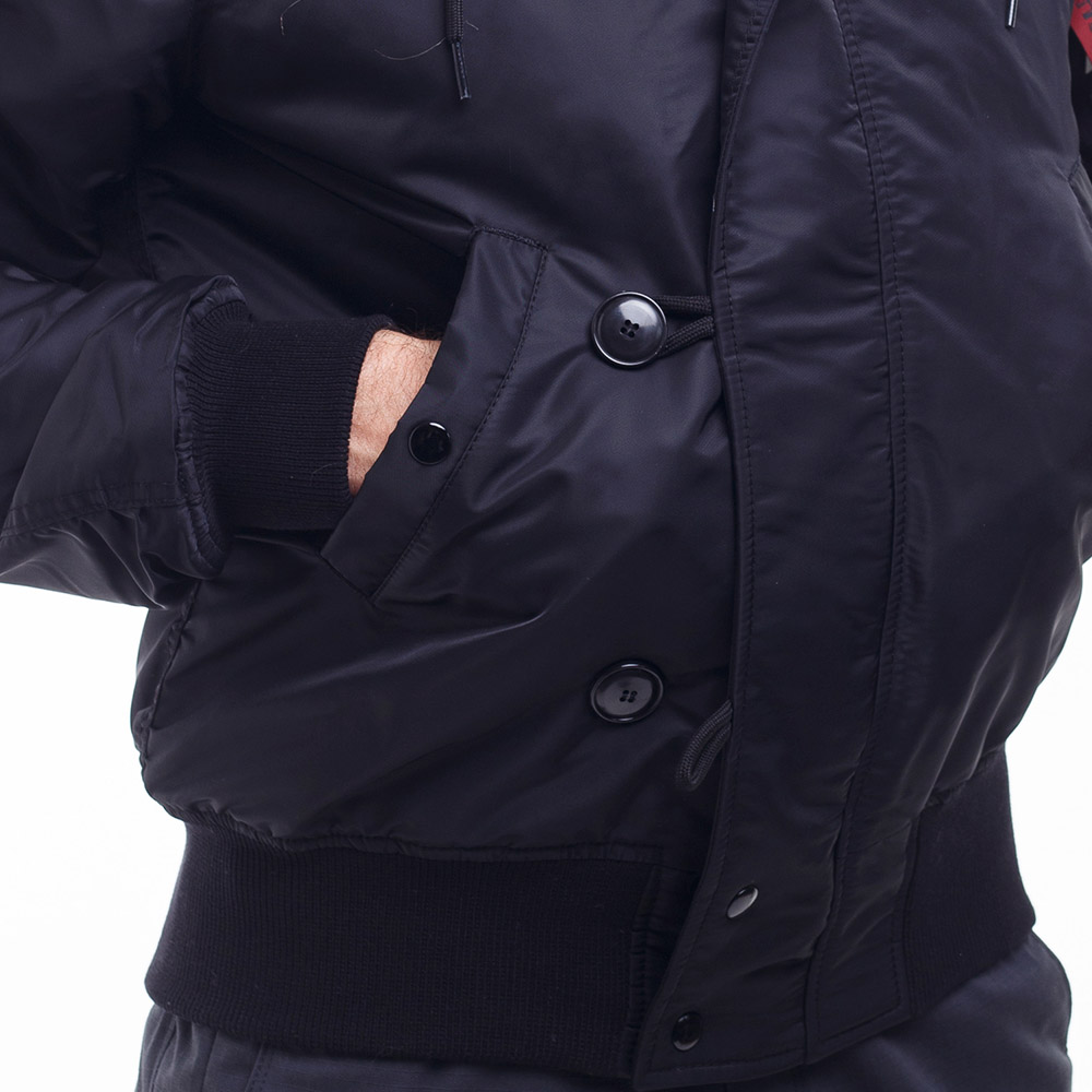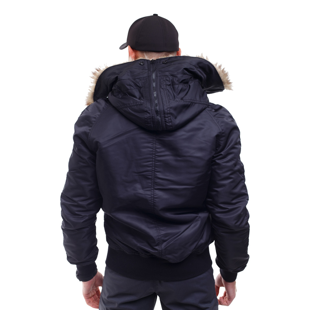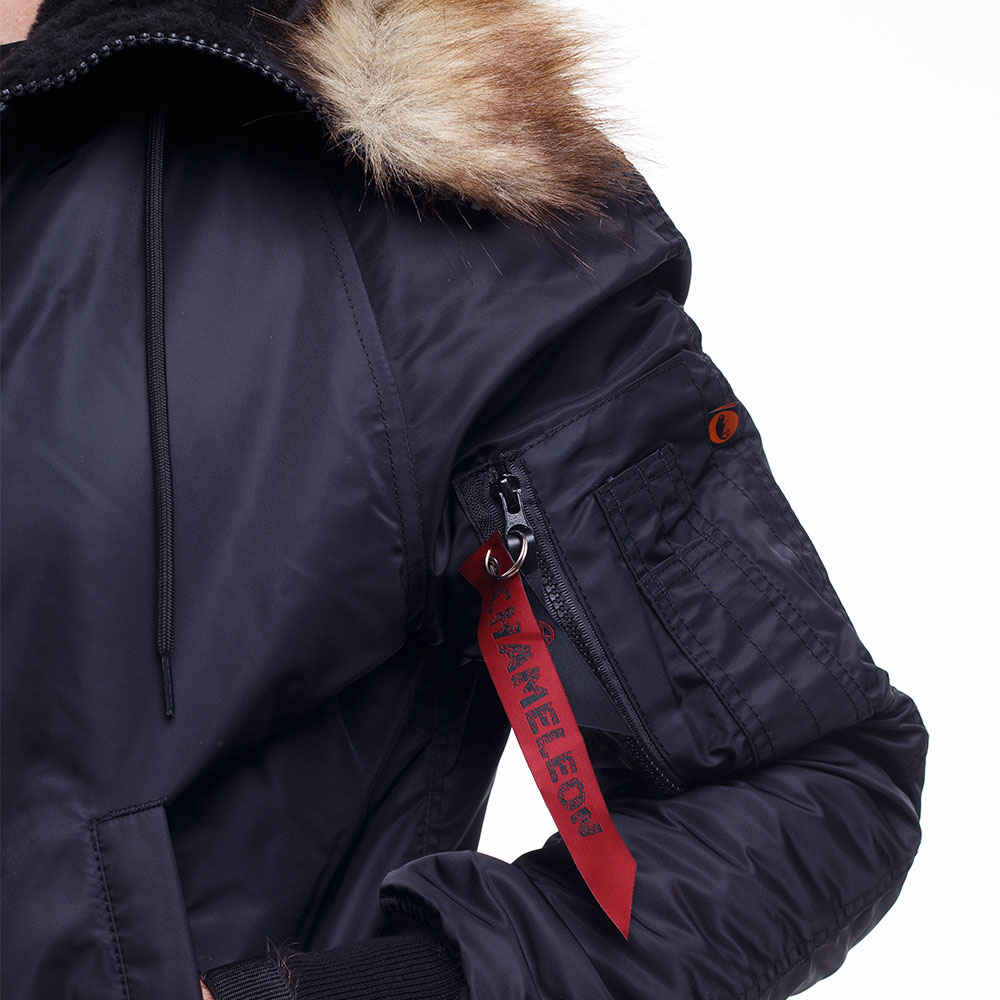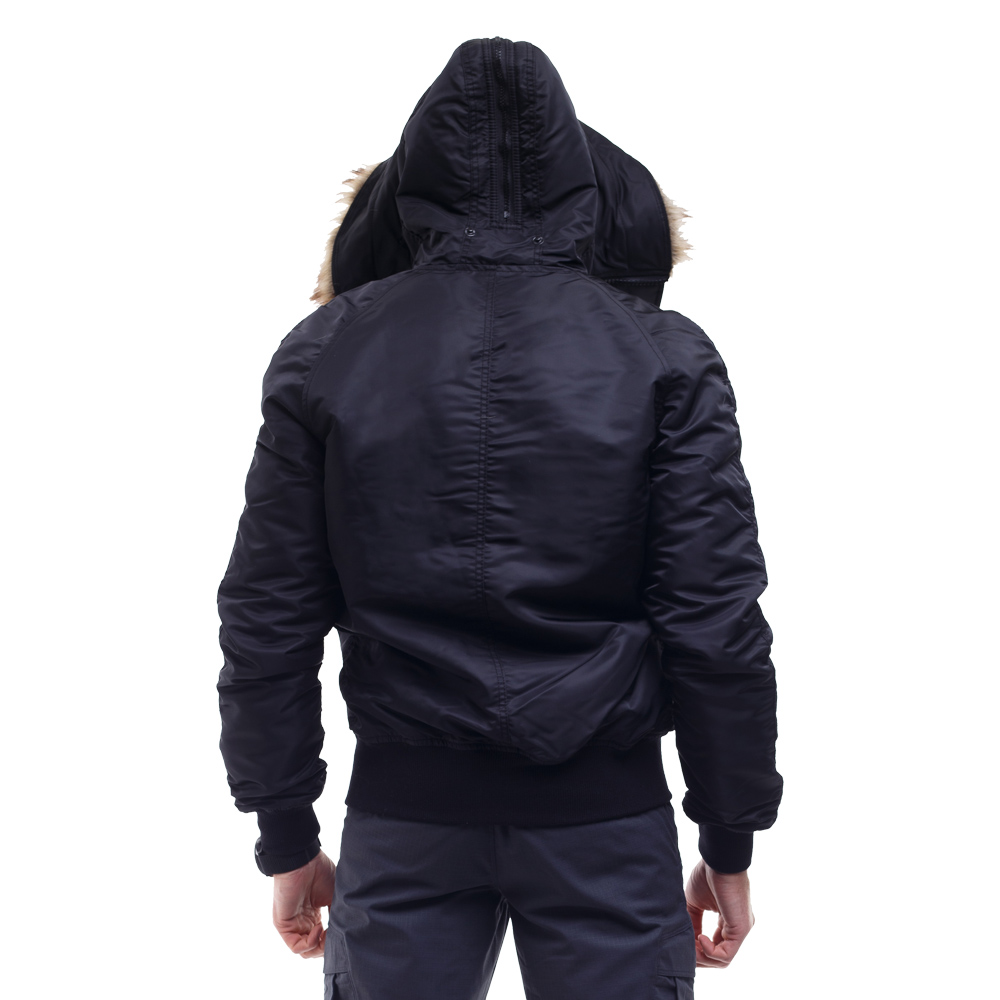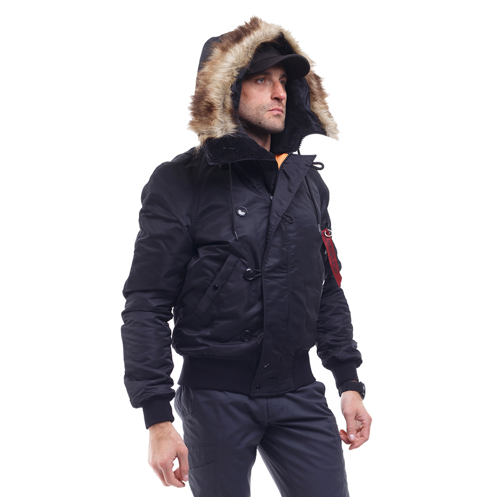 Зимний бомбер N-2B Slim Black зауженного кроя со сноркель капюшоном и яркой оранжевой подкладкой. Капюшон на куртке не отстегивается. Мех на капюшоне не отстегивается. Посередине капюшона присутствует молния, которая разделяет его на две части.