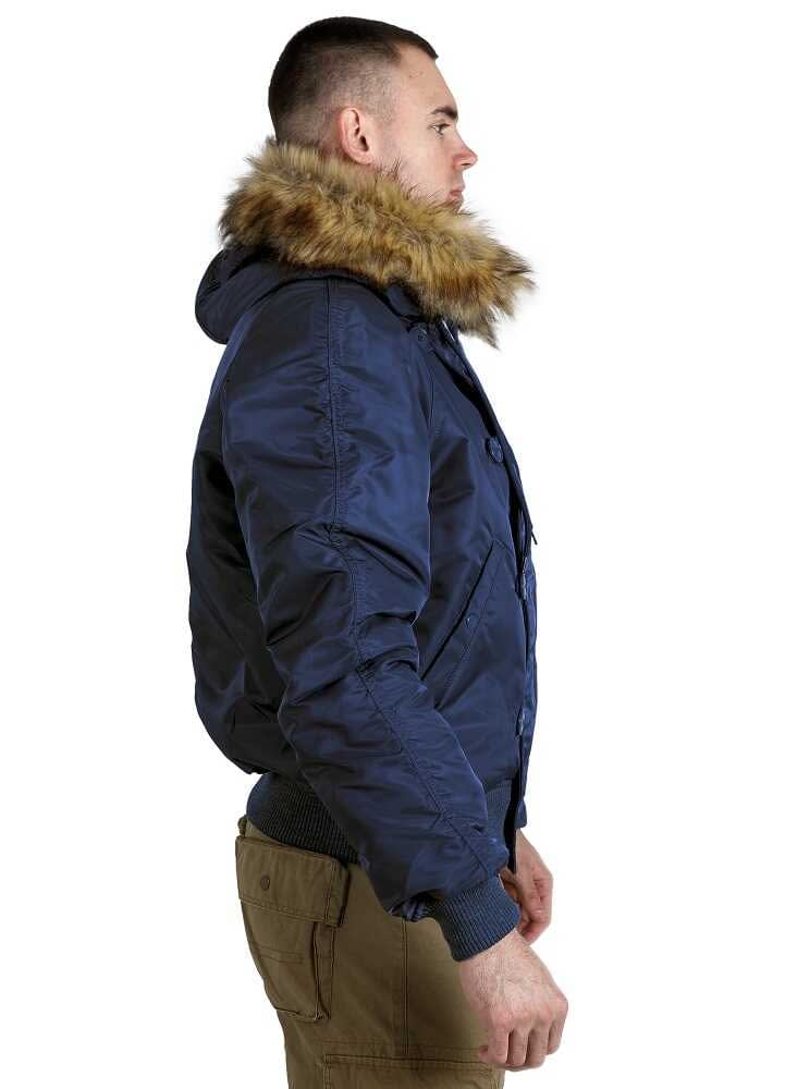 Зимний бомбер N-2B Slim Navy зауженного кроя со сноркель капюшоном и яркой оранжевой подкладкой. Капюшон на куртке не отстегивается. Мех на капюшоне не отстегивается. Посередине капюшона присутствует молния, которая разделяет его на две части.