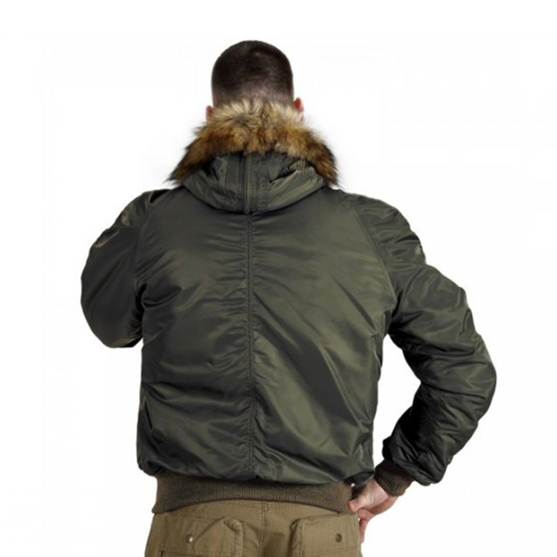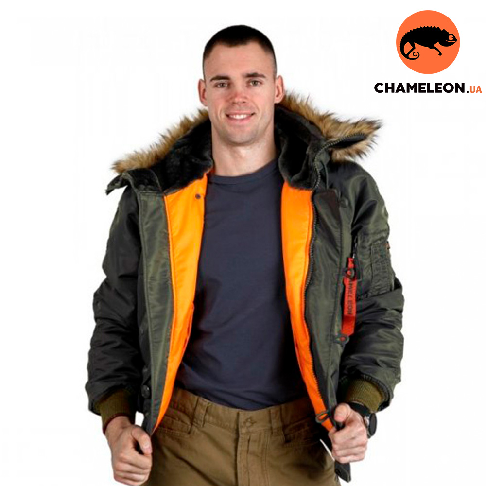 Зимний бомбер N-2B Slim Olive зауженного кроя со сноркель капюшоном и яркой оранжевой подкладкой. Капюшон на куртке не отстегивается. Мех на капюшоне не отстегивается. Посередине капюшона присутствует молния, которая разделяет его на две части.
