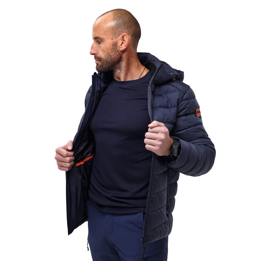 Стеганая синяя мужская куртка спортивная с капюшоном Proxima Navy с центральной застежкой на молнии, съемным капюшоном и утеплителем из биопуха. Изделие предназначено для зимнего и демисезонного периода. Верх куртки изготовлен из дышащего прочного 100% полиэстера, способного выдержать ветреную, дождливую и снежную погоду. Подкладка выполнена из 100% полиэстера. Утеплитель из биопуха обеспечивает комфортный микроклимат до -15°C. Биополимерное волокно биопух сочетает в себе преимущества свойств натурального пуха и синтетического материала. Волокна утеплителя, подобно натуральному пуху, образуют множество полостей с воздухом, обеспечивая превосходные термосберегающие характеристики.