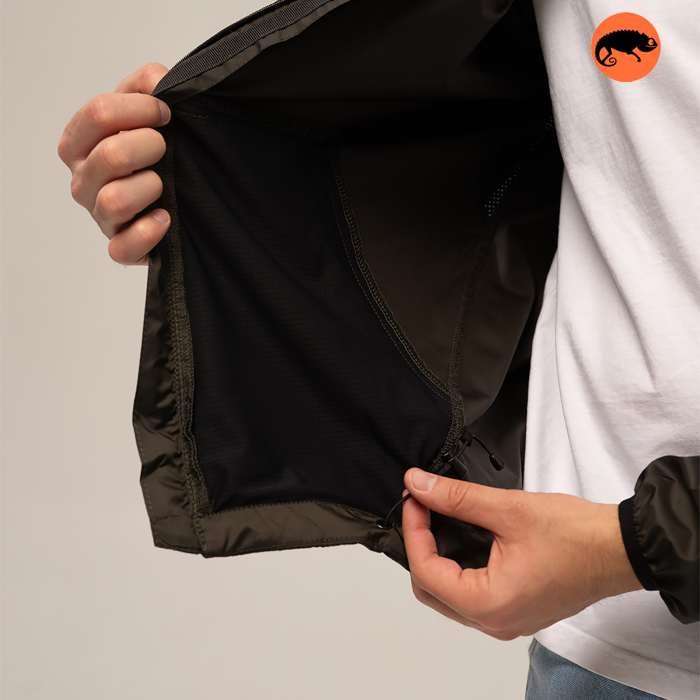 Для поддержания оптимального микроклимата предусмотрены вставки из сетчатой ткани под мышками и на задней части капюшона в области шеи, что улучшает вентиляцию и предотвращает перегрев во время активности.