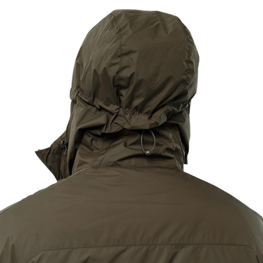 Благодаря плащевой ткани куртка имеет хорошую водоотталкивающую способность. Верх изделия изготовлен из 100 % NYLON 6.6 Cordura (100% нейлон) плотностью 61 г/м2, подкладочная ткань 100 % нейлон плотностью 36 г/м2. Ткань износостойкая, прочная, ветрозащитная. Куртка имеет несъемный утепленный капюшон, который можно регулировать по объему и высоте. Низ куртки также можно регулировать по объему.