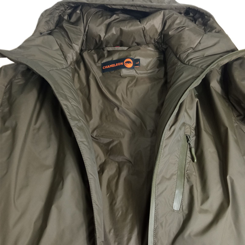 В куртке по бокам расположены два клапана на молниях для доступа к дополнительному снаряжению под курткой и для дополнительной вентиляции. Объем манжетов регулируется на липучках. Манжеты брендированы фирменным лого Сhameleon.