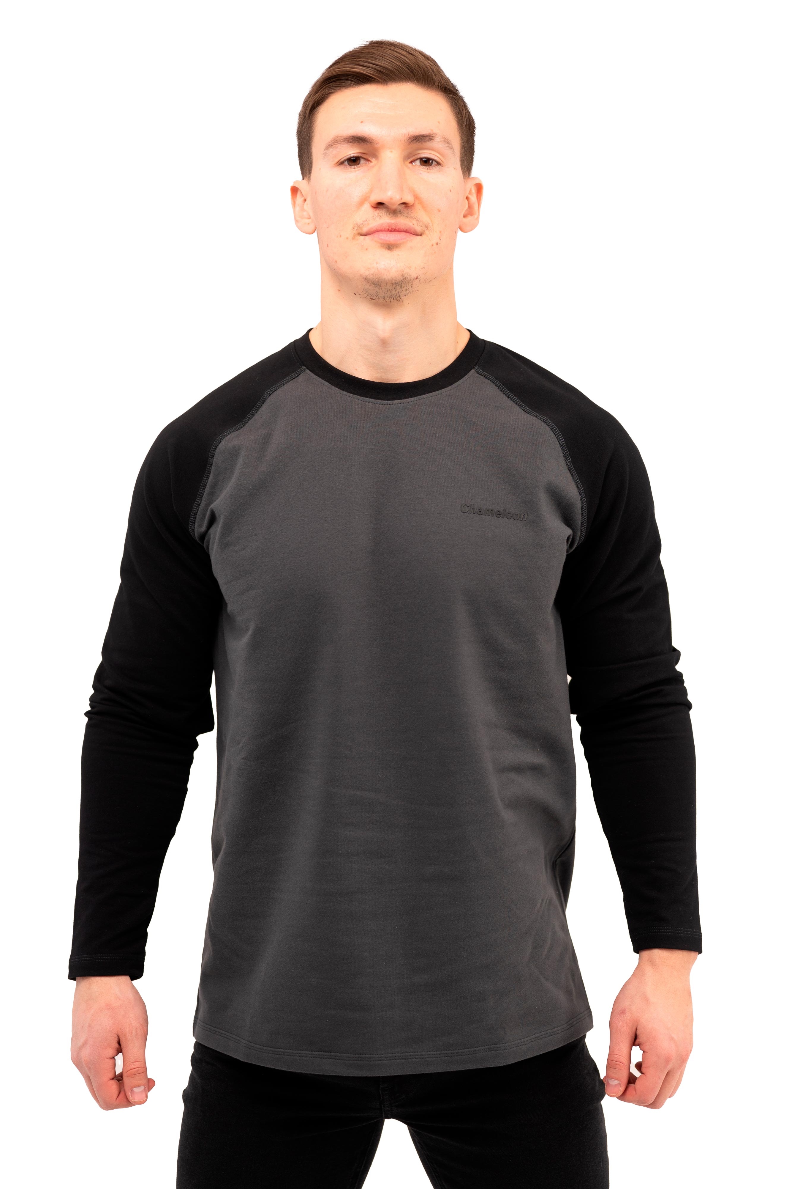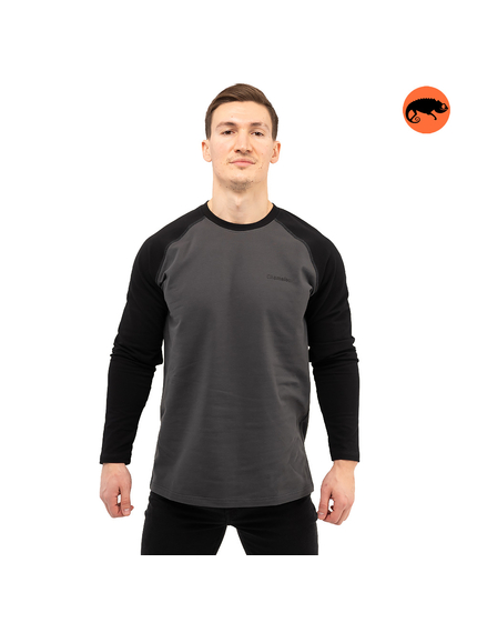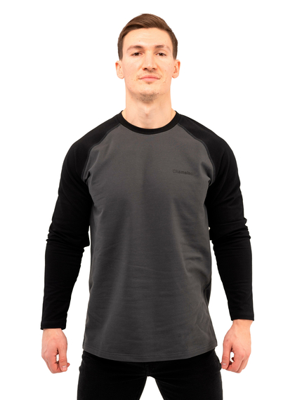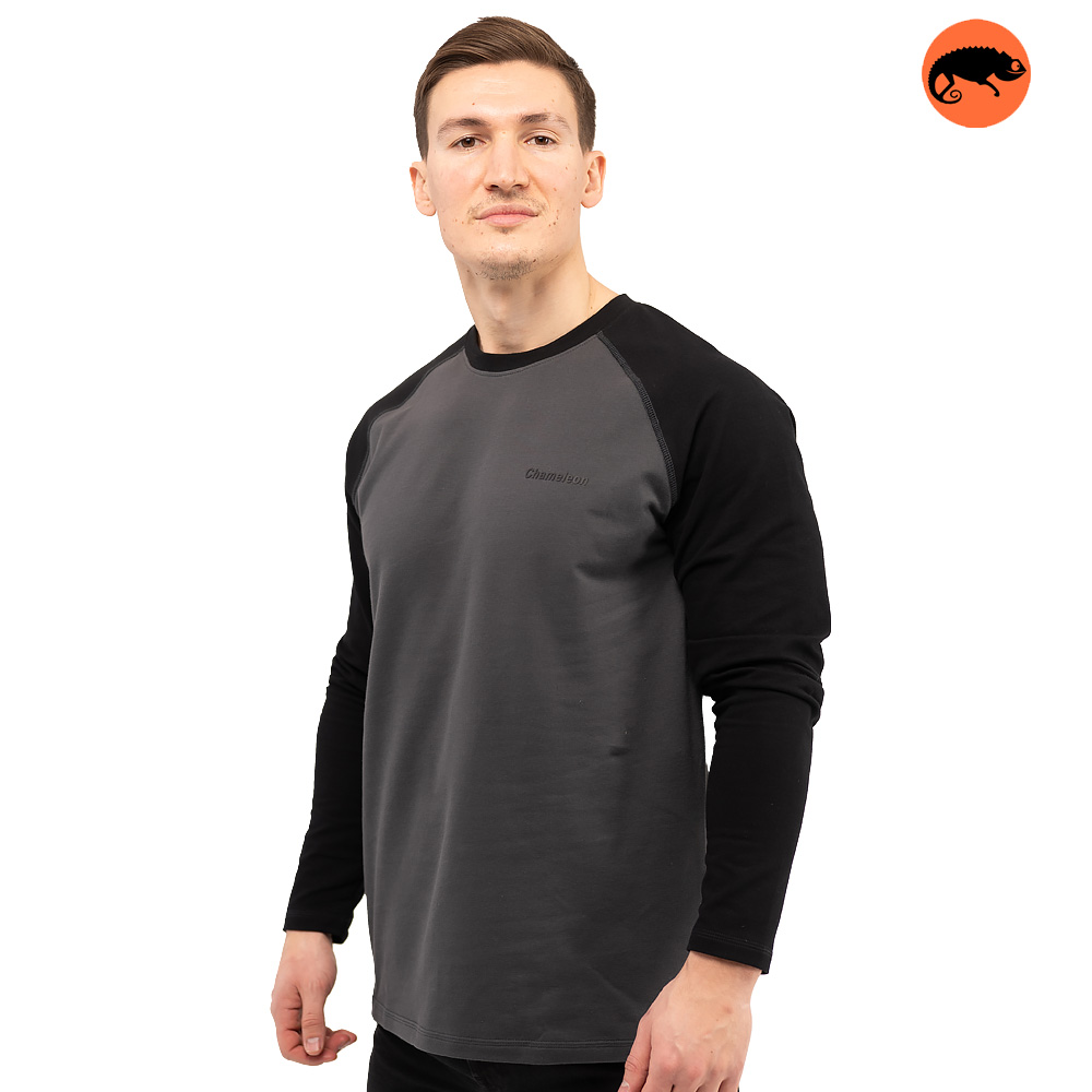 Крой с рукавом реглан добавляет удобства и подчёркивает спортивный характер модели. Двухцветный дизайн: основная часть изделия выполнена в одном цвете, а рукава — в контрастном, что делает лонгслив более выразительным и динамичным.