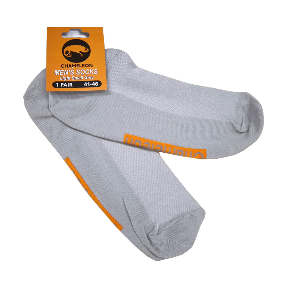 Мужские носки Chameleon outdoor light small Grey прочные и износостойкие, изготовлены из 80% хлопка, 15% полиамида, 5% эластана для современной спортивной экипировки. Материал эластичный с усиленной, крепкой, антибактериальной нитью. Материал хорошо впитывает влагу и препятствует возникновению неприятного запаха, снижает утомляемость мышц, позволяя выдерживать повышенные нагрузки. Носки подойдут отлично для туризма, активного отдыха и спорта, походов и для повседневного использования в теплое время года. Вентиляционные зоны позволяют свободно циркулировать потоку воздуха к ногам, сохраняя ноги сухими во время активного движения.