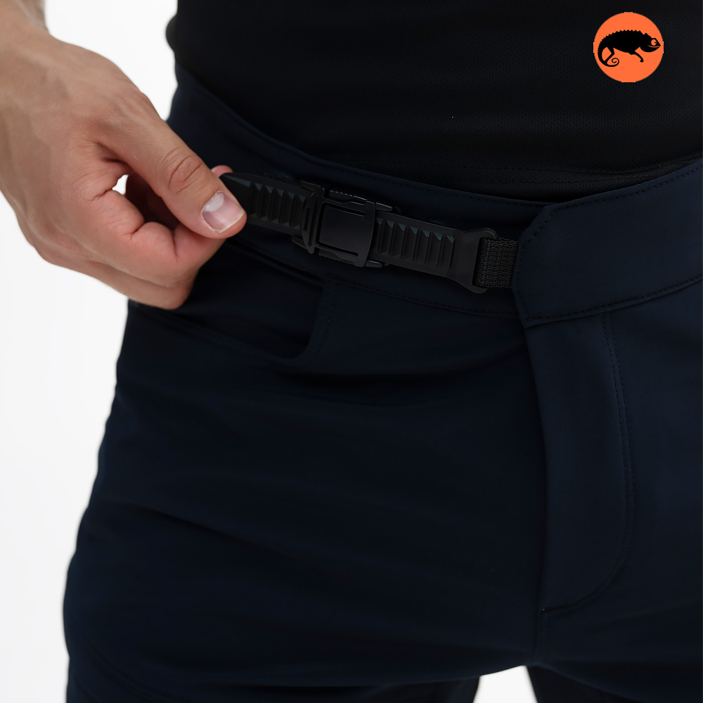 Встроенный ремень с регулировкой позволяет точно подогнать посадку по талии. Брюки оснащены пятью функциональными карманами: два стандартных по бокам, два на бёдрах на молниях и один задний карман на змейке. Внизу штанин предусмотрена регулировка объёма, что удобно для походов, трекинга и тактических задач.