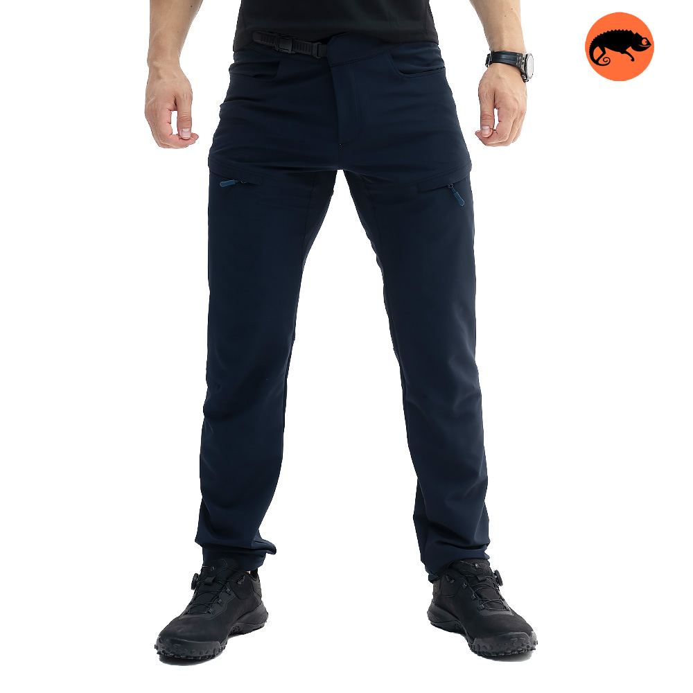 Встроенный ремень с регулировкой позволяет точно подогнать посадку по талии. Брюки оснащены пятью функциональными карманами: два стандартных по бокам, два на бёдрах на молниях и один задний карман на змейке. Внизу штанин предусмотрена регулировка объёма, что удобно для походов, трекинга и тактических задач.