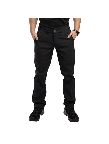 Брюки средней посадки, застегиваются на пуговицу, гульфик на молнии. Широкие шлевки под тактический ремень. Корсажная лента с латексными вставками вшита в пояс для придания изделию дополнительной прочности, предотвращает скольжение, чтобы заправленная в брюки рубашка не выбивалась наружу.
