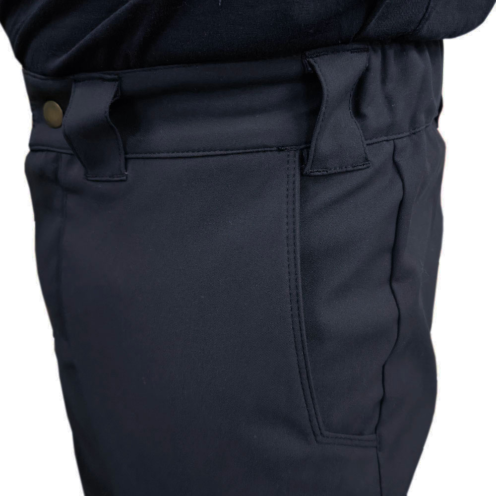 Брюки средней посадки, застегиваются на пуговицу, гульфик на молнии. Широкие шлевки под тактический ремень. Корсажная лента с латексными вставками вшита в пояс для придания изделию дополнительной прочности, предотвращает скольжение, чтобы заправленная в брюки рубашка не выбивалась наружу.