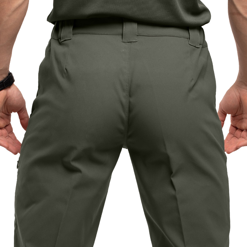 Брюки средней посадки, застегиваются на пуговицу, гульфик на молнии. Широкие шлевки под тактический ремень. Корсажная лента с латексными вставками вшита в пояс для придания изделию дополнительной прочности, предотвращает скольжение, чтобы заправленная в брюки рубашка не выбивалась наружу.