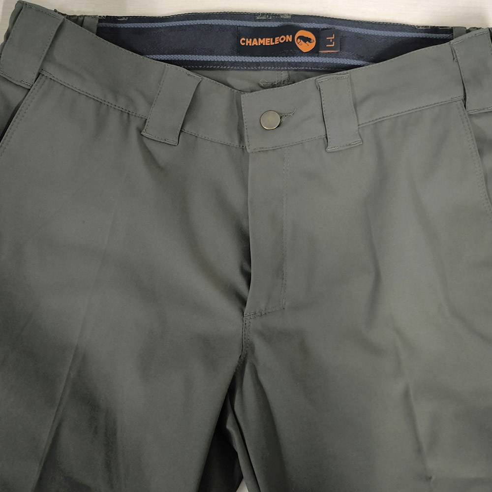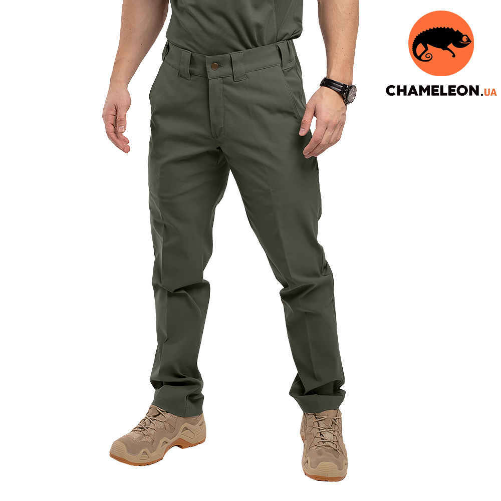 Брюки средней посадки, застегиваются на пуговицу, гульфик на молнии. Широкие шлевки под тактический ремень. Корсажная лента с латексными вставками вшита в пояс для придания изделию дополнительной прочности, предотвращает скольжение, чтобы заправленная в брюки рубашка не выбивалась наружу.
