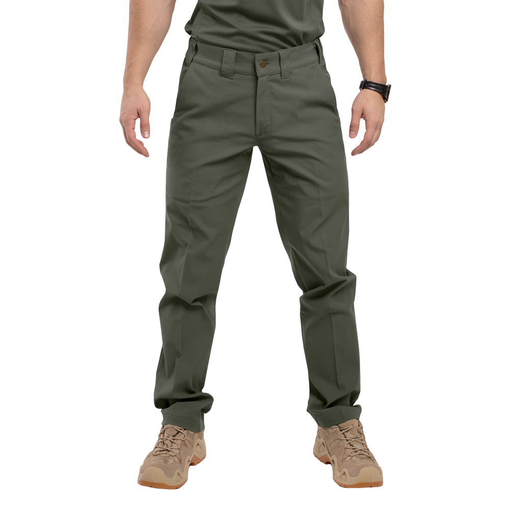 Брюки средней посадки, застегиваются на пуговицу, гульфик на молнии. Широкие шлевки под тактический ремень. Корсажная лента с латексными вставками вшита в пояс для придания изделию дополнительной прочности, предотвращает скольжение, чтобы заправленная в брюки рубашка не выбивалась наружу.