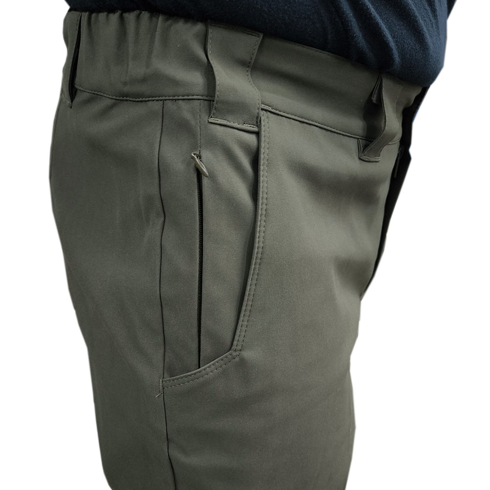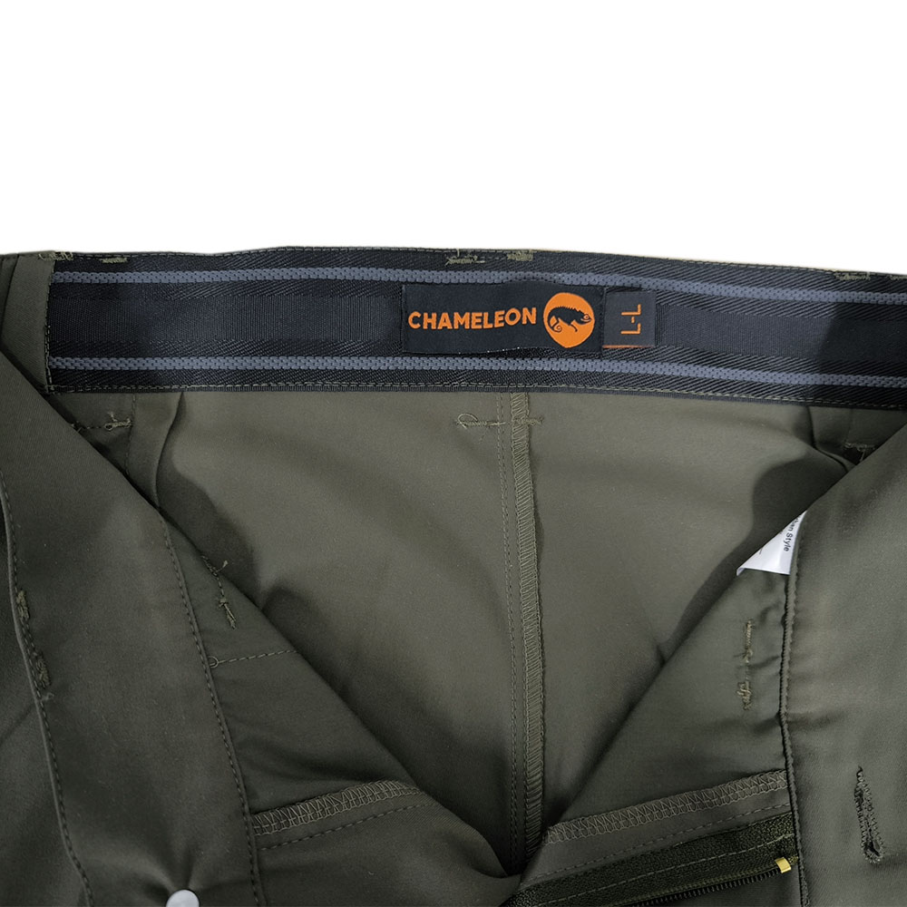 Брюки средней посадки, застегиваются на пуговицу, гульфик на молнии. Широкие шлевки под тактический ремень. Корсажная лента с латексными вставками вшита в пояс для придания изделию дополнительной прочности, предотвращает скольжение, чтобы заправленная в брюки рубашка не выбивалась наружу.