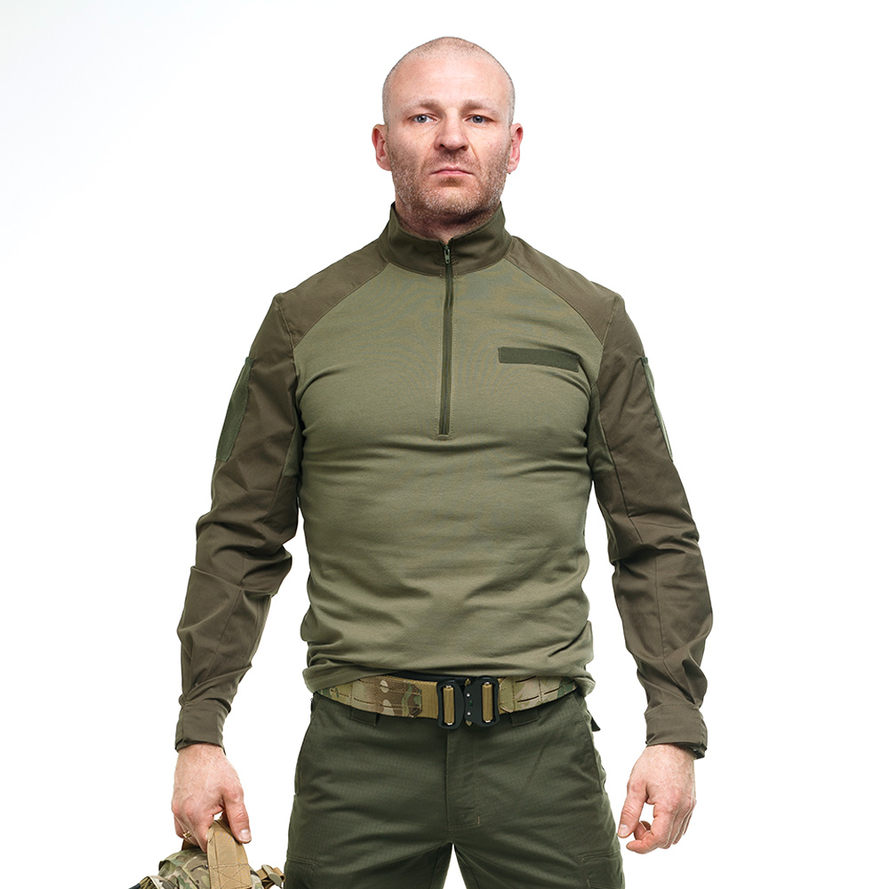 Тактическая рубашка Alpha Summer Flex Olive термофутболка с длинным рукавом, изготовлена из комбинированных тканей. Tактическая рубашка создана на основе военных кителей специально для ношения вместе с бронежилетом или разгрузочной системой в виде жилета, а потому на груди и спине не имеют выступающих частей или карманов. Поэтому область груди, живота и спины выполнена из приятного к телу, мягкого, лёгкого дышащего материала (95 % хлопка и 5% эластана), который хорошо пропускает воздух и не даёт скользить надетому поверх бронежилету.