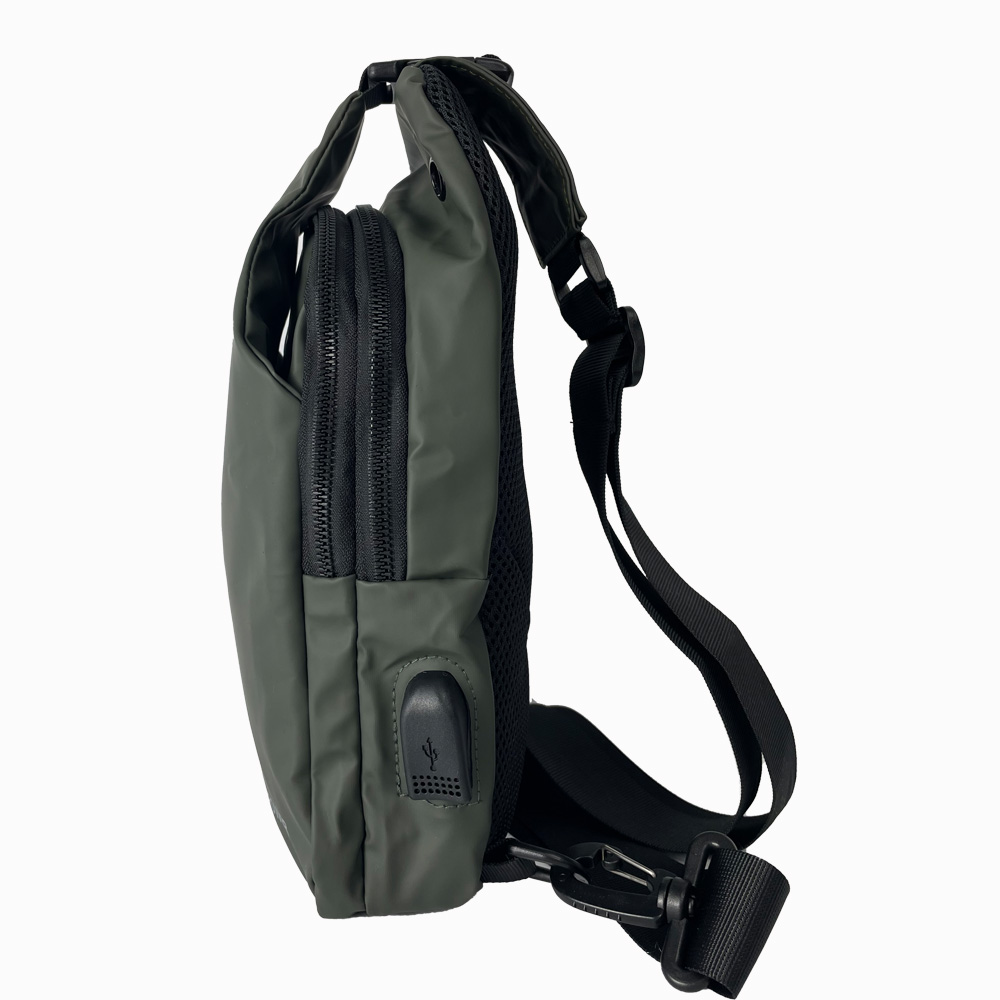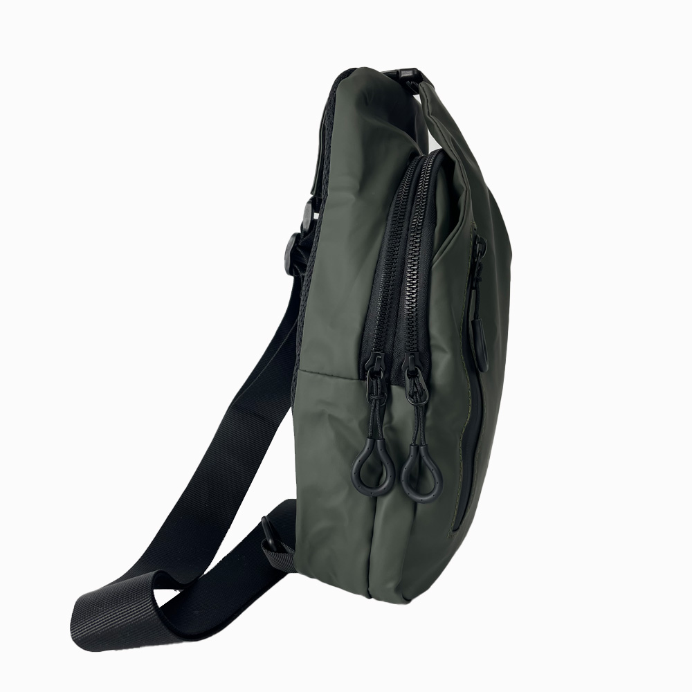 В слинге два основных отдела на змейках с дополнительным закрытием в виде клапана с карабином в верхней части. Под клапаном расположен еще один отдел без замка. С лицевой наружной стороны есть небольшой вертикальный кармашек на молнии. Тыльная сторона выполена в виде «дышащей» сеточки, предотвращает скольжение и хорошо пропускает воздух, что очень комфортно, особенно в летний период.