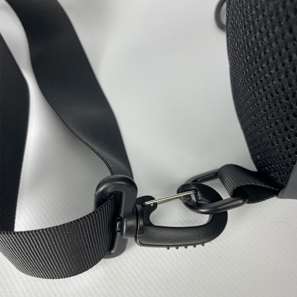 Наплечный ремень текстильный, регулируется по длине, перестёгивается на удобную сторону с помощью карабина.