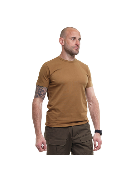 Чоловіча футболка Jersey  Coyote виконана з комбінації 95% натуральної бавовни та 5% еластану, щільністю 200-210 г/м2. Футболка в міру вільного крою комфортно облягає тіло і при активності не здавлює, забезпечуючи свободу рухів. Тканина має гарні дихаючі властивості, вбирає і відводить вологу, підтримуючи комфортну температуру. Якісне пошиття та нитки еластану не дають футболці втратити форму при регулярному носінні та пранні. Футболка підійде для щоденного використання, для активного відпочинку, занять спортом.