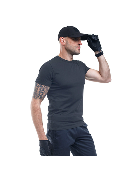 Темно-сіра чоловіча футболка Jersey Grey виготовлена з комбінації 95% натуральної бавовни та 5% еластану, щільністю 200-210 г/м2. Виріб у міру вільного крою, зручно сідає по фігурі.