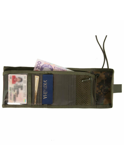 Гаманець ID Wallet Marpat - компактний та функціональний аксесуар для зберігання кредитних карток, посвідчень та грошей. Зовнішній матеріал міцна тканина 1000D CORDURA®, внутрішній – поліестер, краї обшиті текстильною стрічкою. Габаритні розміри у складеному вигляді 14*12*3 см, у розкладеному 32*12 см. Вага 100 грам. На гаманець пришита петля з паракорду, що дозволяє носити гаманець на шиї.