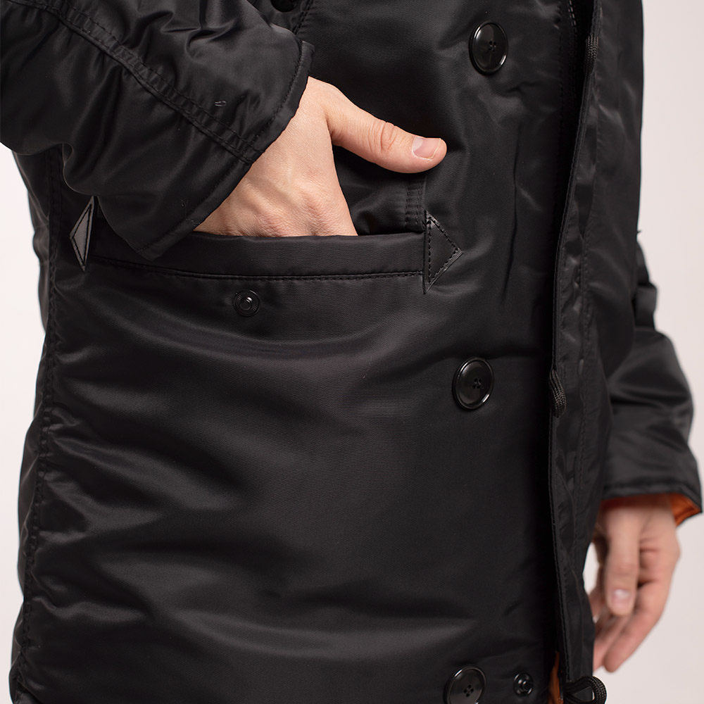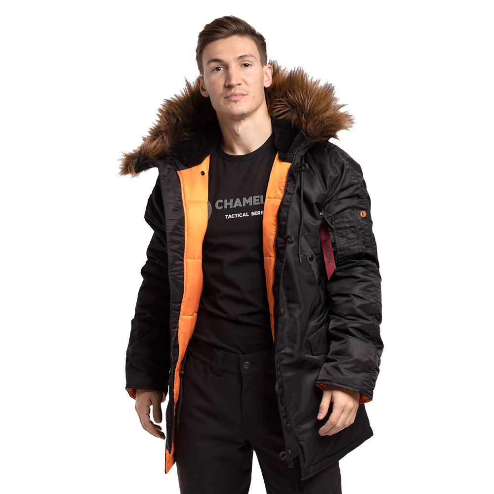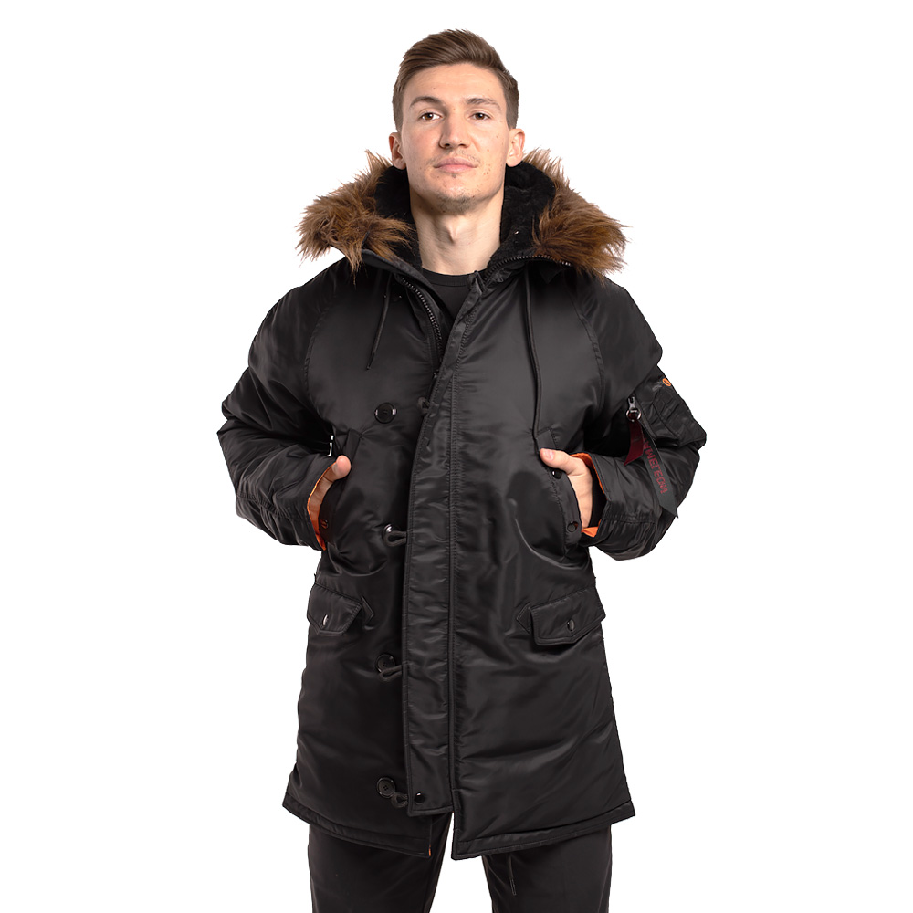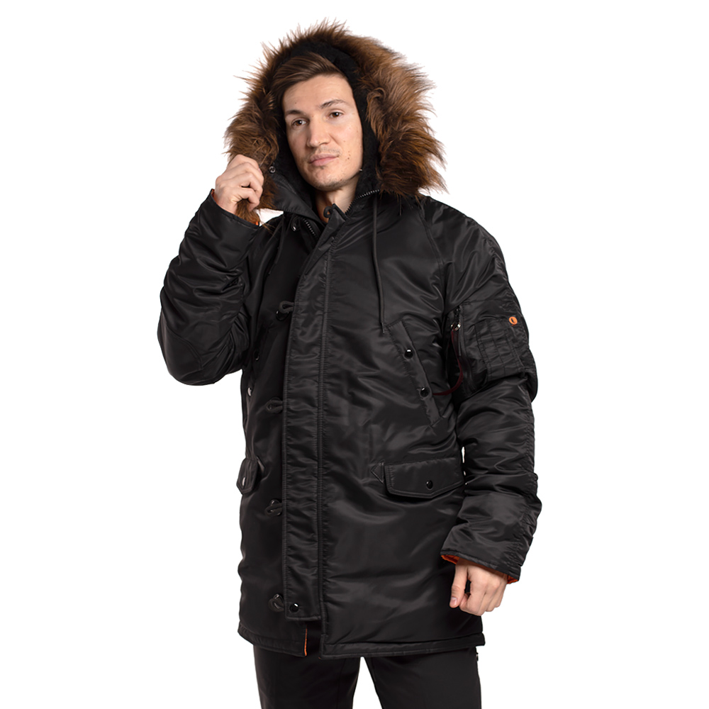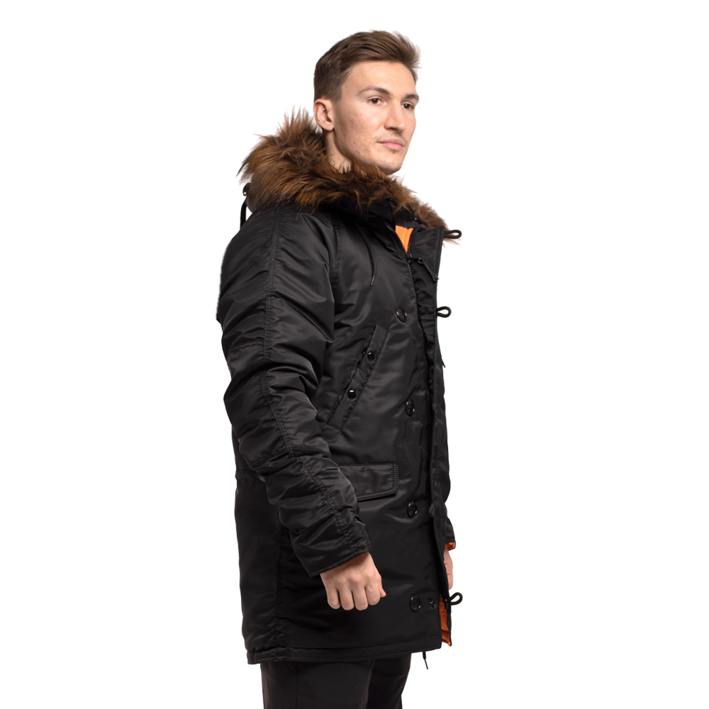 Класична зимова чоловіча парка Аляска N-3B Black вище колін стандартного крою з яскравою помаранчевою підкладкою. Ця куртка має більш вільний крій порівняно з моделями Slim.