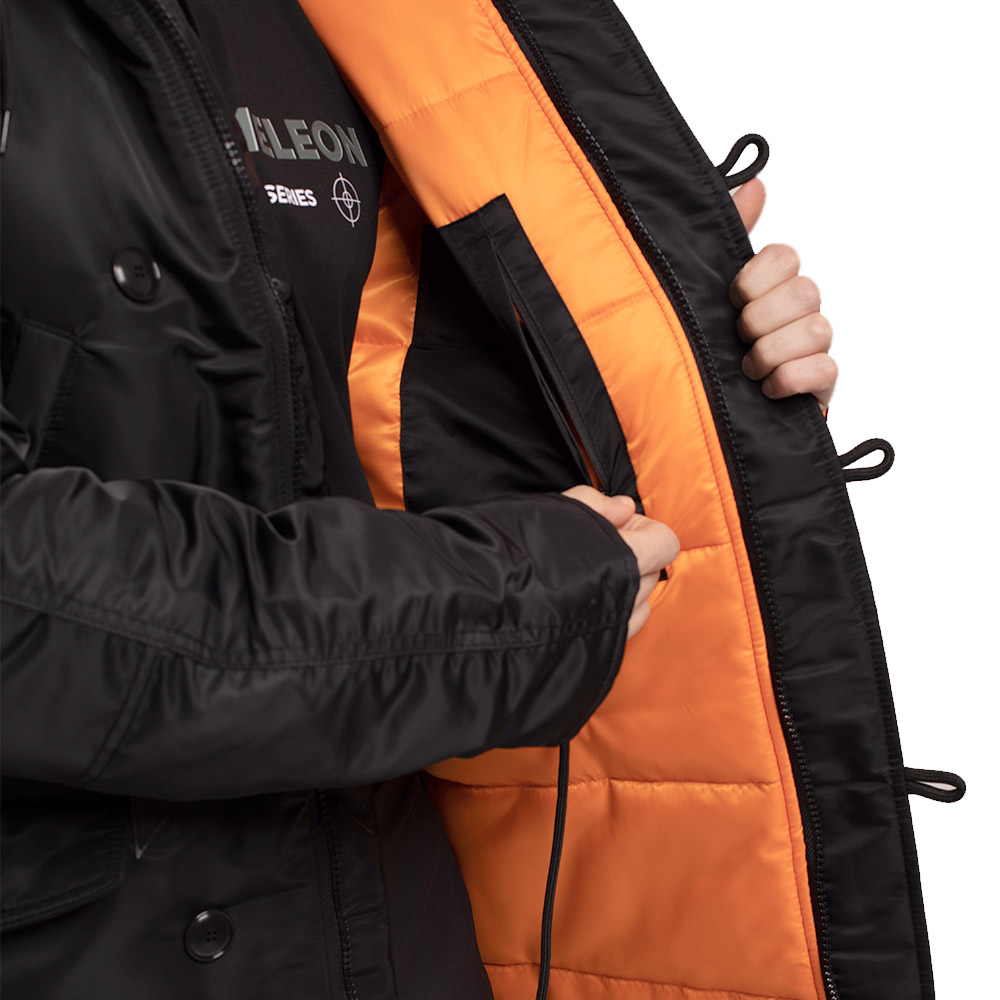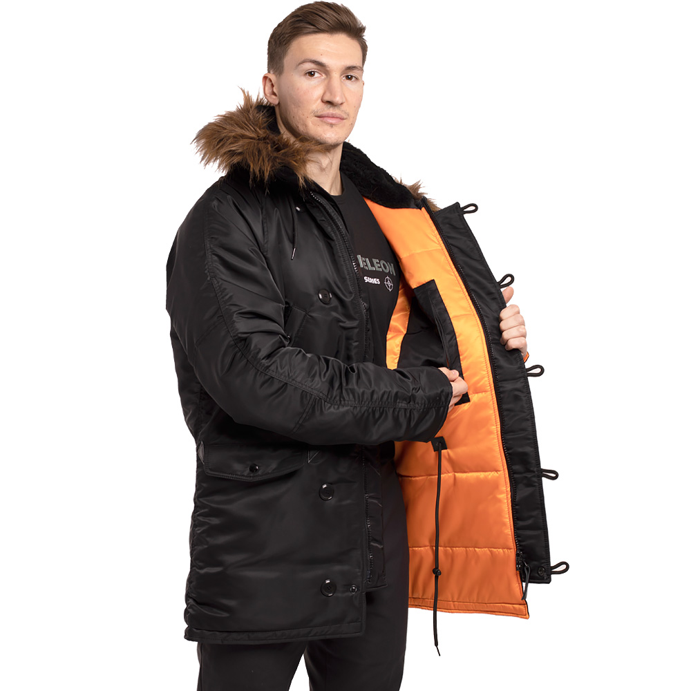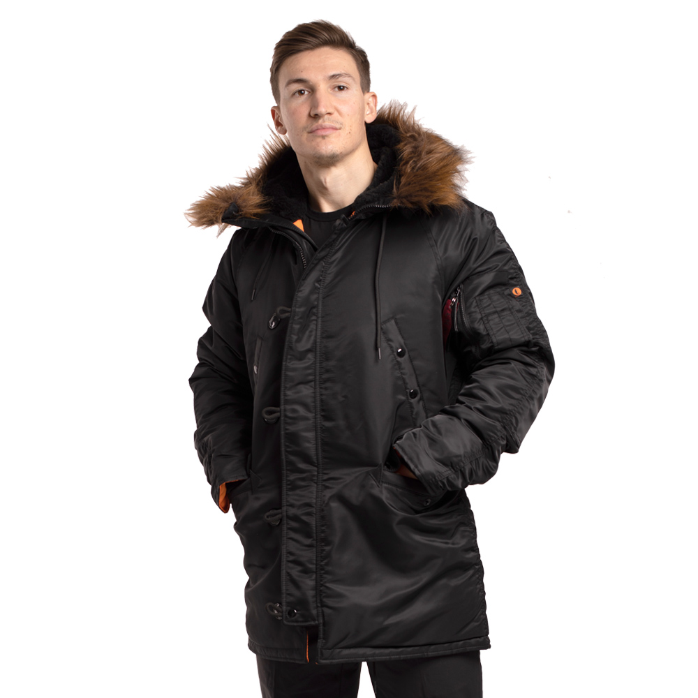 Класична зимова чоловіча парка Аляска N-3B Black вище колін стандартного крою з яскравою помаранчевою підкладкою. Ця куртка має більш вільний крій порівняно з моделями Slim.