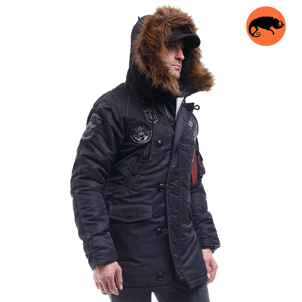 Зимова куртка чоловіча чорна Аляска N-3B Top Gun Black парка вище колін (звуженого крою). Зовнішній шар виконаний з міцного 100% нейлону з водовідштовхувальним просоченням. Щільність тканини 150г/м2. Ця тканина добре захищає від холодного вітру і дощу. Можна носити за температури -15 С.