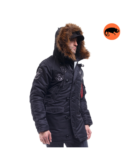 Зимова куртка чоловіча чорна Аляска N-3B Top Gun Black парка вище колін (звуженого крою). Зовнішній шар виконаний з міцного 100% нейлону з водовідштовхувальним просоченням. Щільність тканини 150г/м2. Ця тканина добре захищає від холодного вітру і дощу. Можна носити за температури -15 С.