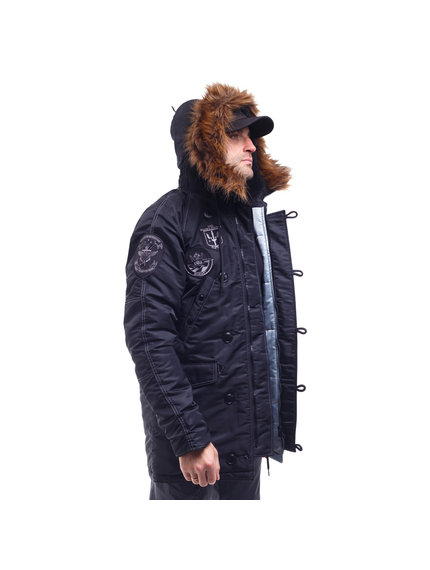 Зимова куртка чоловіча чорна Аляска N-3B Top Gun Black парка вище колін (звуженого крою). Зовнішній шар виконаний з міцного 100% нейлону з водовідштовхувальним просоченням. Щільність тканини 150г/м2. Ця тканина добре захищає від холодного вітру і дощу. Можна носити за температури -15 С.