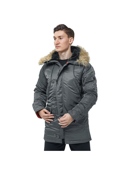 Сіра чоловіча куртка Аляска Slim Fit N-3B Gray подовжена - зимова парка вище колін (звуженого крою) з темно-червоною підкладкою. Зовнішній шар виконаний з міцного 100% нейлону з водовідштовхувальним просоченням. Щільність тканини 150г/м2. Ця тканина добре захищає від холодного вітру і дощу.  Можна носити за температури -15 С.