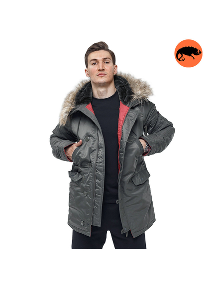 Сіра чоловіча куртка Аляска Slim Fit N-3B Gray подовжена - зимова парка вище колін (звуженого крою) з темно-червоною підкладкою. Зовнішній шар виконаний з міцного 100% нейлону з водовідштовхувальним просоченням. Щільність тканини 150г/м2. Ця тканина добре захищає від холодного вітру і дощу. Можна носити за температури -15 С.