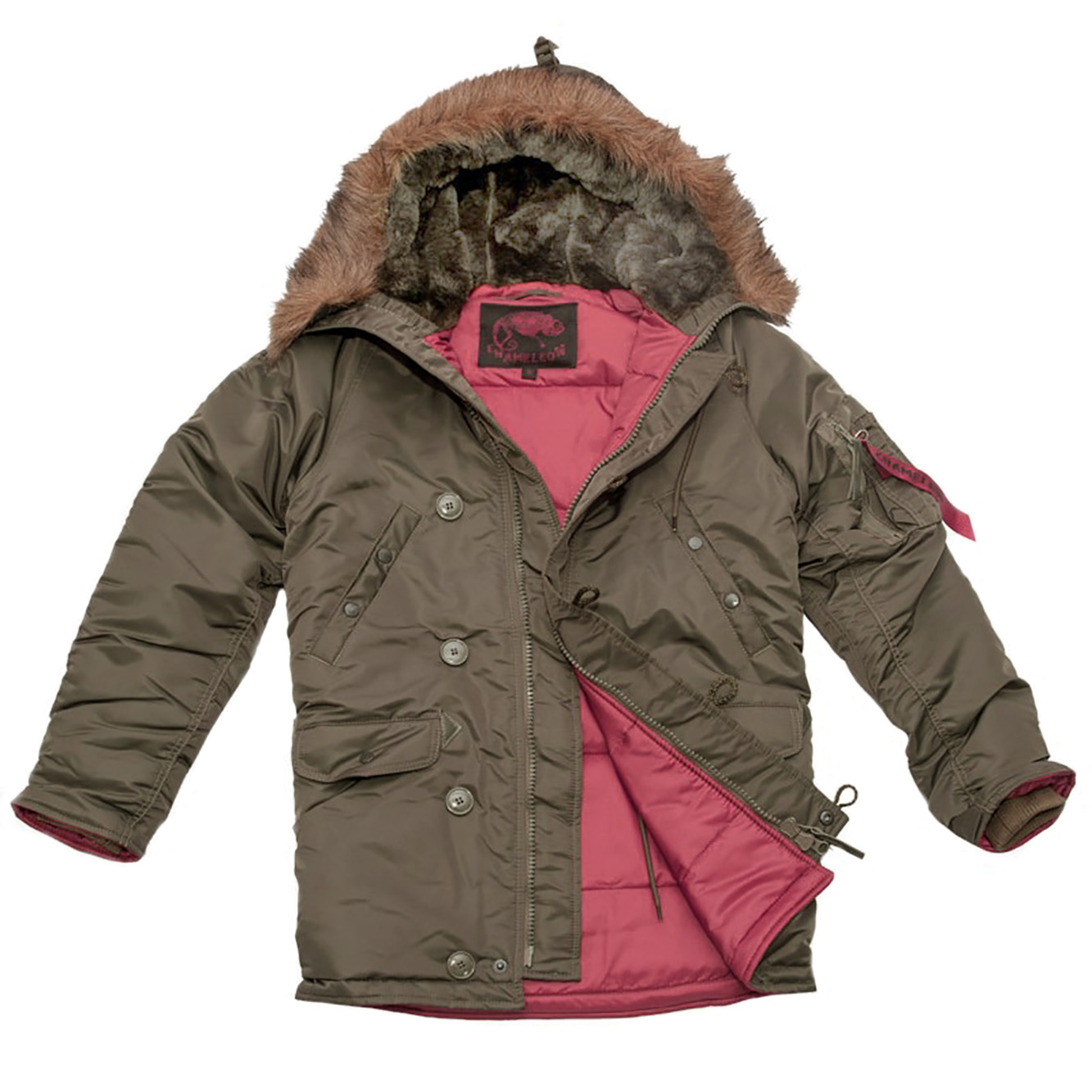 Куртка Аляска чоловіча Slim Fit N-3B Tundra - зимова парка вище колін (звуженого крою) з темно-червоною підкладкою. Зовнішній шар виконаний з міцного 100% нейлону з водовідштовхувальним просоченням. Щільність тканини 150г/м2. Ця тканина добре захищає від холодного вітру і дощу. Можна носити за температури -15 С.