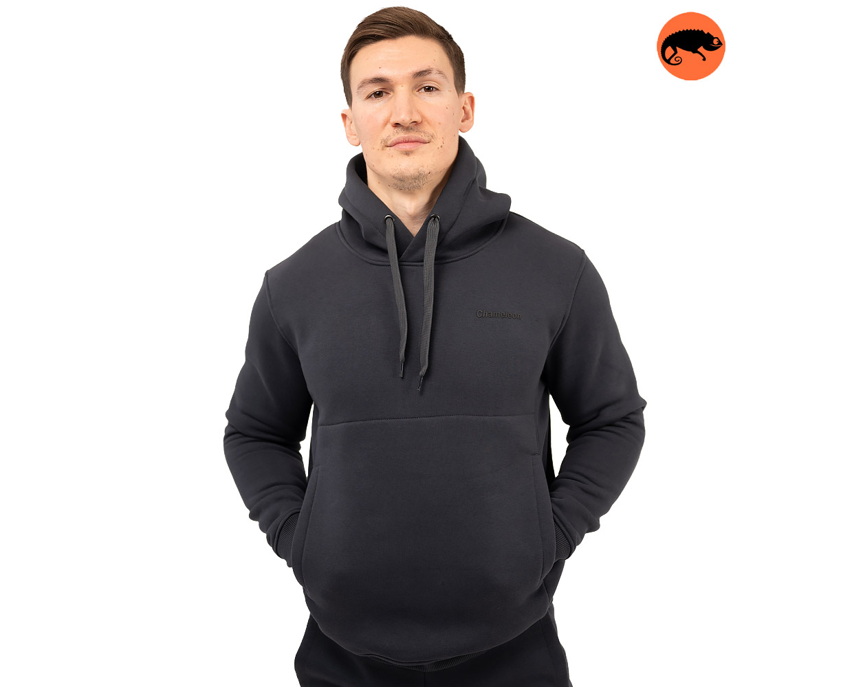 Кофта худі чоловіча чорна Anorak warm Gen2 з логотипом бренду Chameleon виготовлена з м'якого, приємного на дотик якісного трикотажу з начосом (бавовна 80%, поліестер 20%, щільністю 320 г/м2.) Чорне худі з капюшоном, який регулюється завдяки широкому шнурку, спереду розташована функціональна велика наскрізна зручна кишеня.