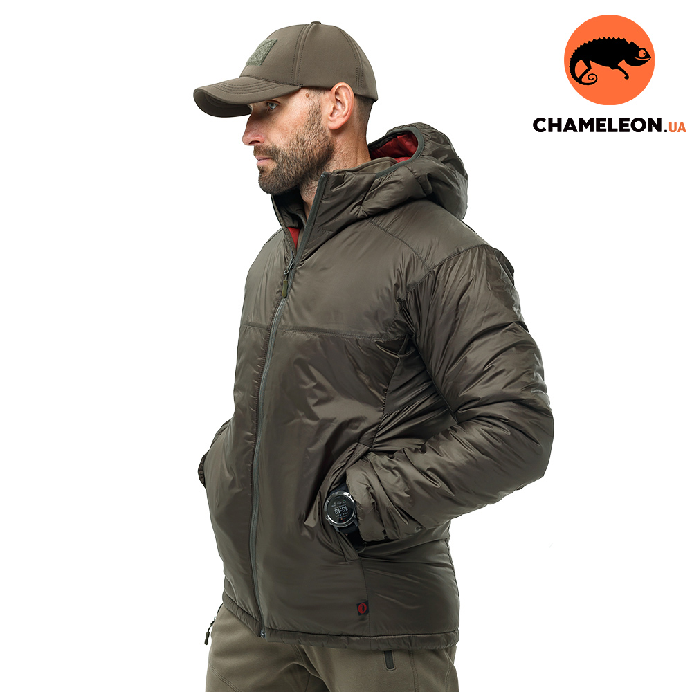 Чоловіча куртка олива Dufour Olive для зимового періоду із центральною застібкою на блискавці з яскравою бордовою підкладкою. Виріб підійде для вітряної погоди та дрібного дощу та снігу. Температура комфорту -15°C.