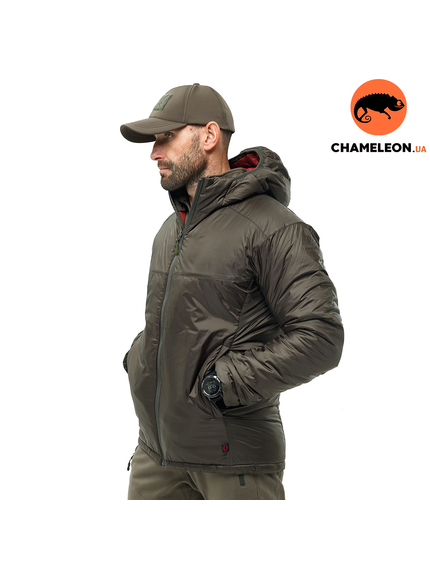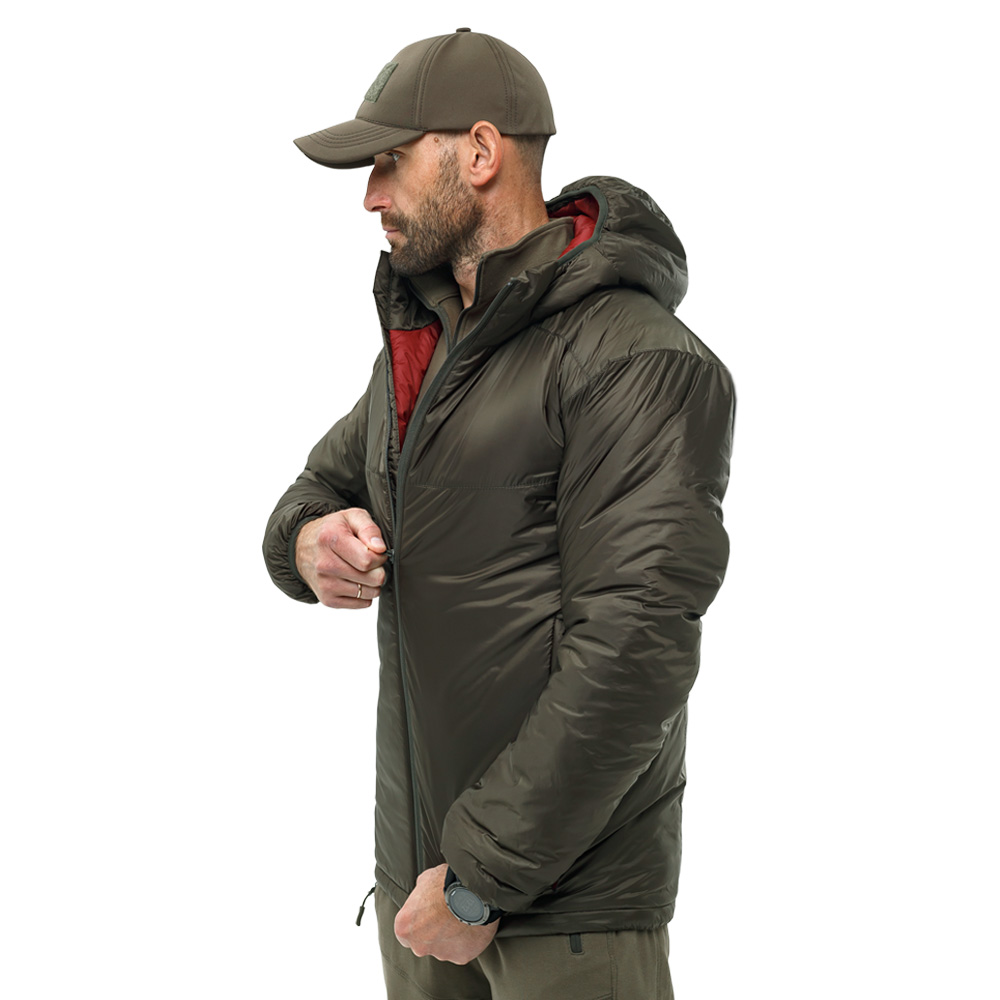 Чоловіча куртка олива Dufour Olive для зимового періоду із центральною застібкою на блискавці з яскравою бордовою підкладкою. Виріб підійде для вітряної погоди та дрібного дощу та снігу. Температура комфорту -15°C.