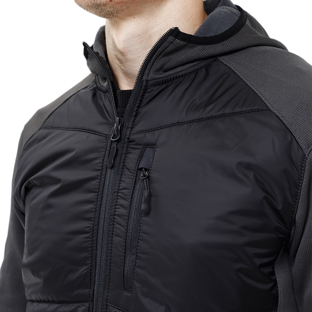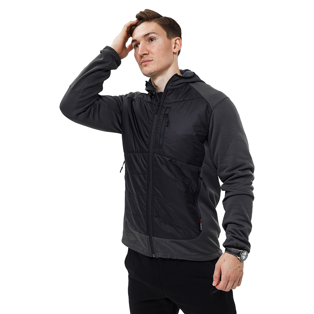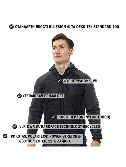 Чоловіча куртка Legioner Grey/Black з утеплювачем Primaloft пошита з приємного на дотик комбінованого матеріалу. Верх виготовлений з еластичного трикотажу з подвійною поверхнею Polartec® Power Stretch® з поліестеру з густим ворсом з додаванням волокон лайкри (88% поліестеру, 12% лайкра), щільністю 224 г/м2. Кожна ворсинка всередині порожниста має складну трубчасту структуру. Принцип дії – це ефект сухого тепла, що забезпечується за рахунок високого рівня вентиляції та малого коефіцієнта поглинання вологи. М'яка еластична тканина Power Stretch® має міцні еластичні волокна, що забезпечують розтяг у чотирьох напрямках. Дихаюча тканина забезпечує вам легкість і свободу в русі, є легкою і добре відводить від тіла вологу. Тканина має особливу конструкцію, що складається з двох унікальних поверхонь: міцний, гладкий вітро та зносостійкий зовнішній шар та м'який приємний для тіла внутрішній шар мікрофлісу, який поглинає вологу зі шкіри на 25% більше ніж інші матеріали, що застосовуються для нижнього шару одягу. Зовнішня поверхня Power Stretch має покриття з низьким коефіцієнтом тертя, тому ця універсальна тканина чудово поєднується з іншими матеріалами і сама по собі стійка до стирання.
