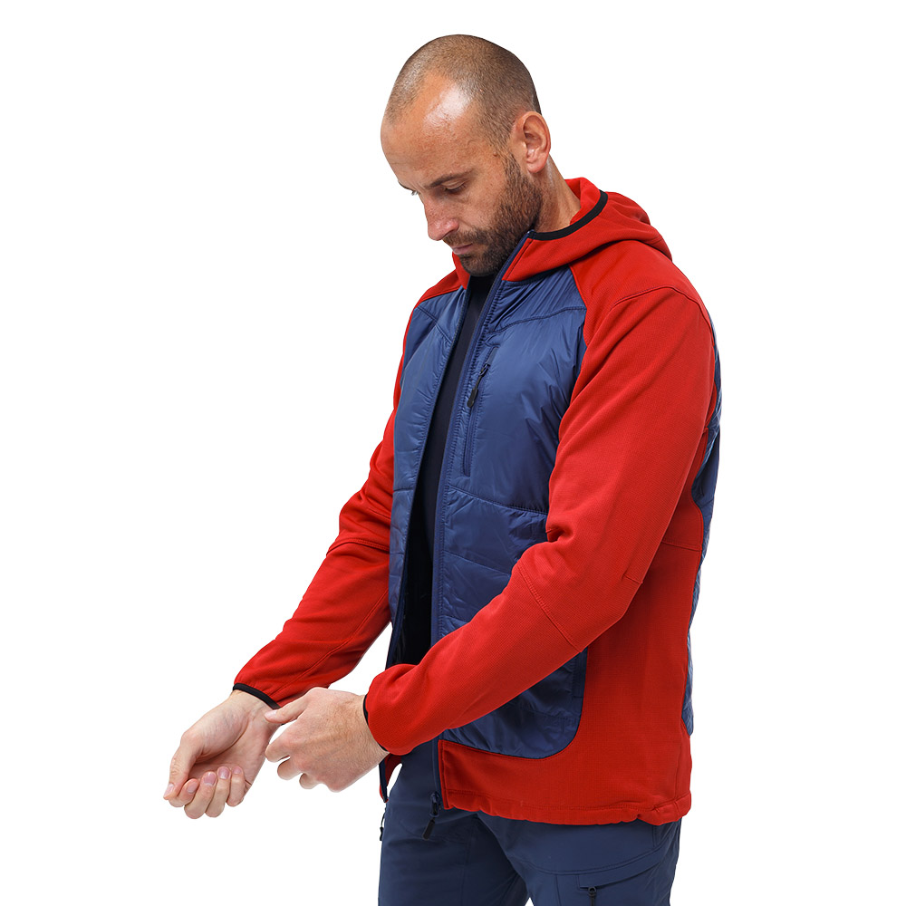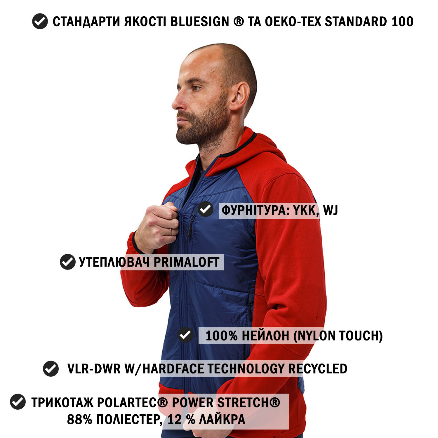 Чоловіча куртка Legioner Red/Blue з утеплювачем Primaloft пошита з приємного на дотик комбінованого матеріалу. Верх виготовлений з еластичного трикотажу з подвійною поверхнею Polartec® Power Stretch® з поліестеру з густим ворсом з додаванням волокон лайкри (88% поліестеру, 12% лайкра), щільністю 224 г/м2. Кожна ворсинка всередині порожниста має складну трубчасту структуру. Принцип дії – це ефект сухого тепла, що забезпечується за рахунок високого рівня вентиляції та малого коефіцієнта поглинання вологи. М'яка еластична тканина Power Stretch® має міцні еластичні волокна, що забезпечують розтяг у чотирьох напрямках. Дихаюча тканина забезпечує вам легкість і свободу в русі, є легкою і добре відводить від тіла вологу. Тканина має особливу конструкцію, що складається з двох унікальних поверхонь: міцний, гладкий вітро та зносостійкий зовнішній шар та м'який приємний для тіла внутрішній шар мікрофлісу, який поглинає вологу зі шкіри на 25% більше ніж інші матеріали, що застосовуються для нижнього шару одягу. Зовнішня поверхня Power Stretch має покриття з низьким коефіцієнтом тертя, тому ця універсальна тканина чудово поєднується з іншими матеріалами і сама по собі стійка до стирання.
