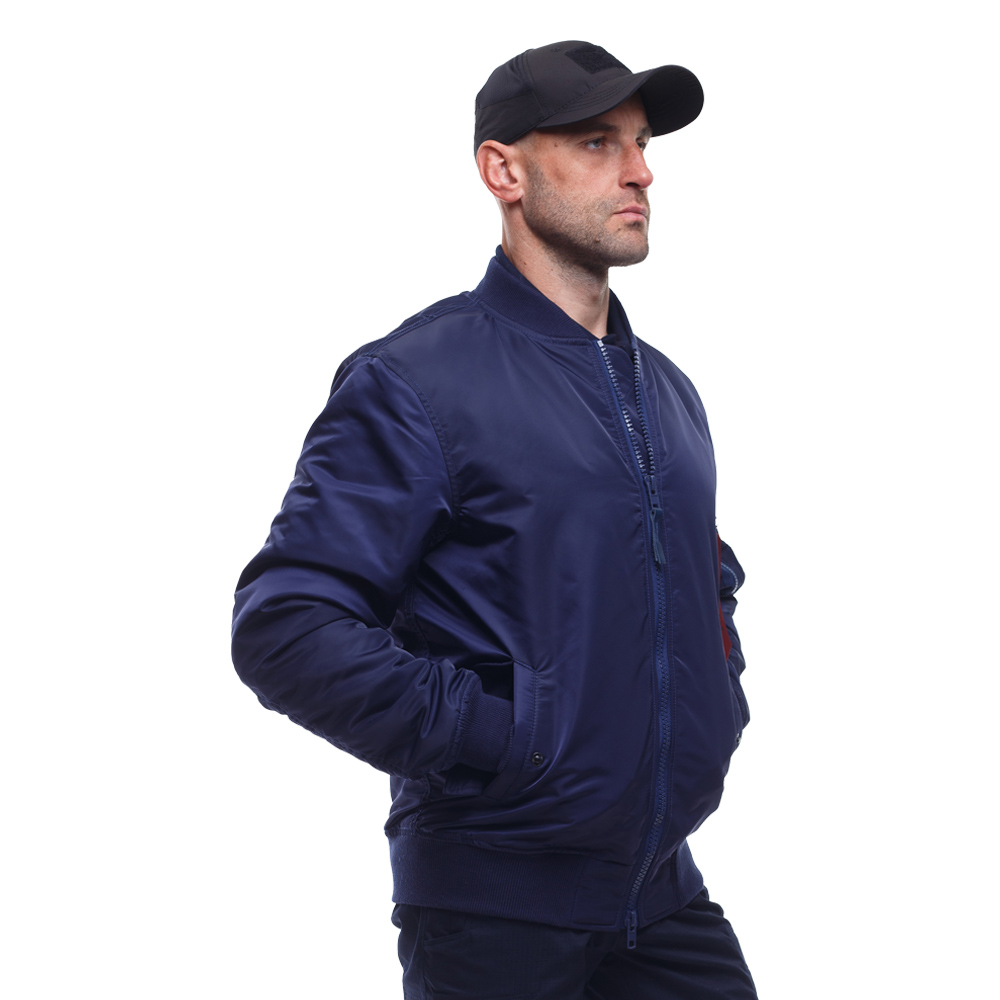 Демісезонна куртка бомбер чоловіча темно-синя MA-1 Gen 2 Navy – це льотна куртка з бордовою поліестеровою підкладкою. Зовнішній шар виконаний з міцного 100% нейлону з водовідштовхувальним просоченням. Щільність тканини 150г/м2. Ця тканина добре захищає від холодного вітру і дощу.