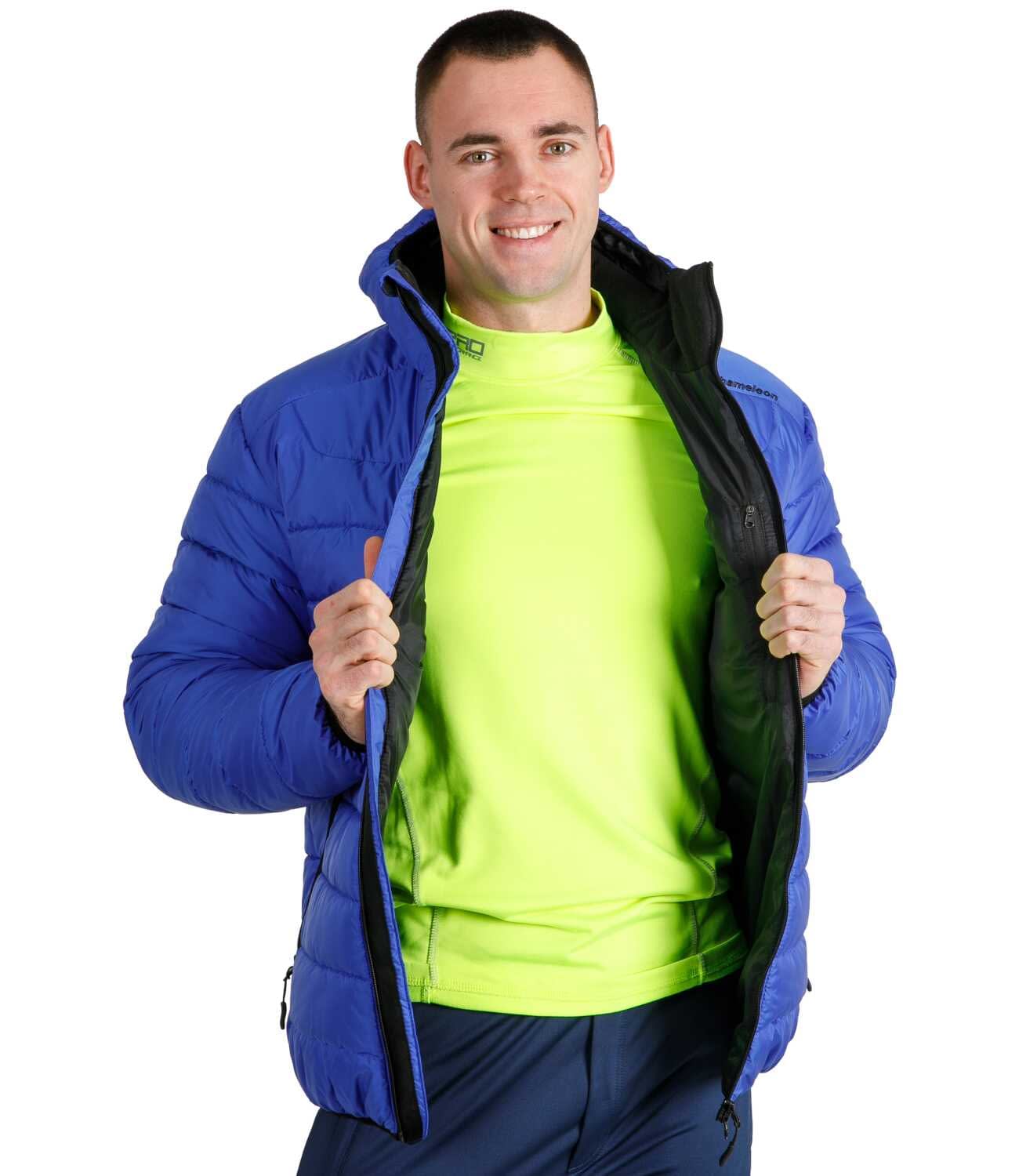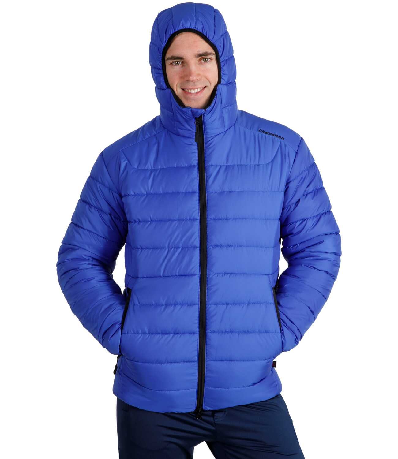 Синя чоловіча куртка з капюшоном Maximus Blue виконана з легкого дихаючого поліестеру з водовідштовхувальним просоченням, яке здатне витримати слабкий дощ. Теплий капюшон з еластичним кантом і високий комір захищають від вітру та холоду. Манжети та низ виробу прошиті еластичним кантом, що запобігає потраплянню холодного повітря всередину. Куртка має вільний крій, при цьому добре сидить на фігурі. Можна носити за температури -5 С. Утеплювач каландрований штучний лебединий пух преміум класу, 100% поліестер.