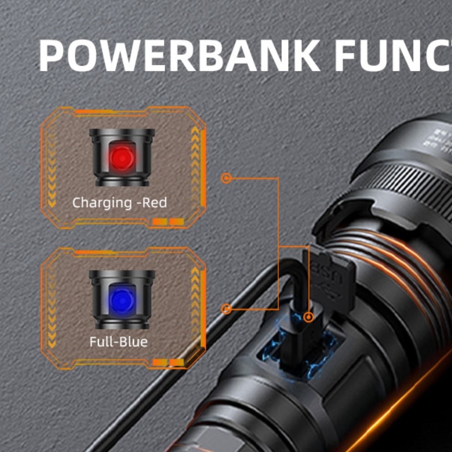- Натисніть кнопку живлення, щоб увімкнути ліхтарик (слабкий-середній-сильний-сильний-стробоскоп-SOS), циклічно перемикаючи п'ять режимів. Для вимкнення утримуйте натисканням 2 секунди.