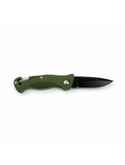 Рукоять ножа G611 green має зручну ергономічну форму і виконана з ударостійкого пластику зеленого кольору. Відмінною рисою моделі G611 green є наявність вбудованого в ручку свистка, який дозволяє подати попереджувальний сигнал під час непередбаченої ситуації або небезпеки. Також на рукояті розташований карабін, який дозволяє закріпити ніж G611 green на поясі або туристичному спорядженні. Замок Liner Lock надійно фіксує лезо (як у відкритому, так і в закритому положенні). Дана модель стане вашим незамінним помічником під час відпочинку на природі та в походах.