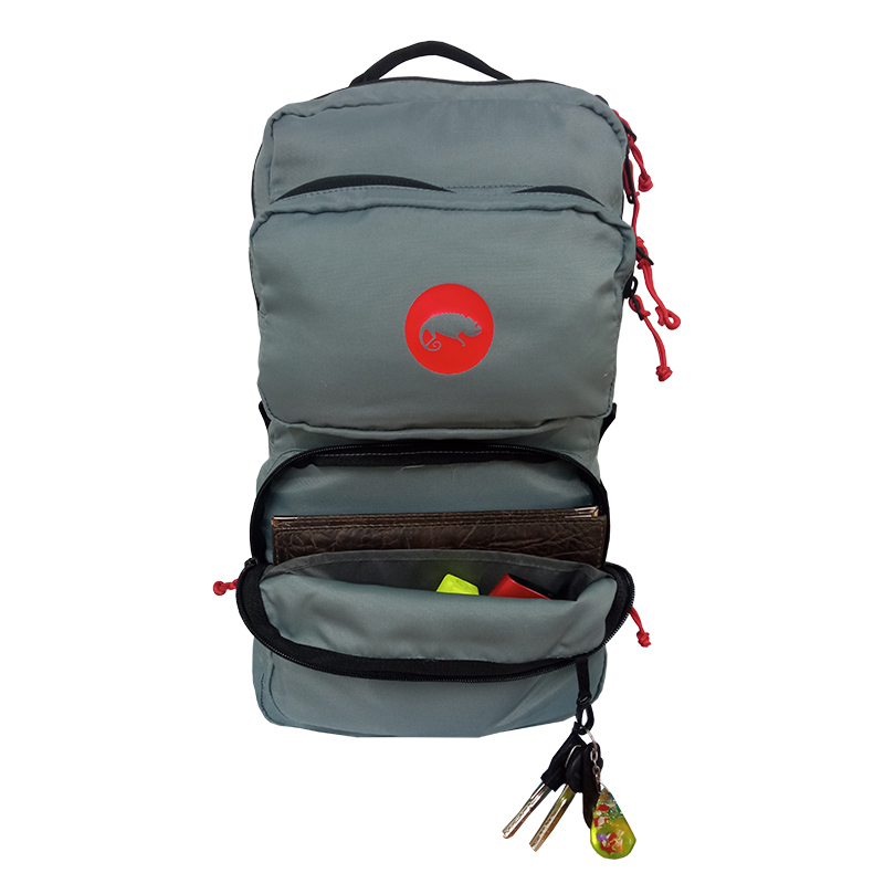Рюкзак має 3 відділення горизонтального завантаження. У великому основному відділенні є містка кишеня. Також передбачено чохол, щоб складати у нього рюкзак. У рюкзаку є отвір із прогумованого матеріалу хайполон для виведення гідратора (питна система). За допомогою такої системи ви зможете пити воду, не використовуючи руки і не уповільнюючи темп руху. Для фіксації гідротрубки у відділенні передбачена петля з велкро-липучкою. Середнє відділення декороване логотипом Chameleon, призначене для різних дрібних речей. Зовнішнє відділення для розміщення дрібних речей, де можна розміщувати канцелярію, ключі та інше. Відділення закриваються міцними застібками блискавками. Бігунки на блискавках оснащені хлястиками з паракорду, що надає зручності користування навіть у рукавичках.