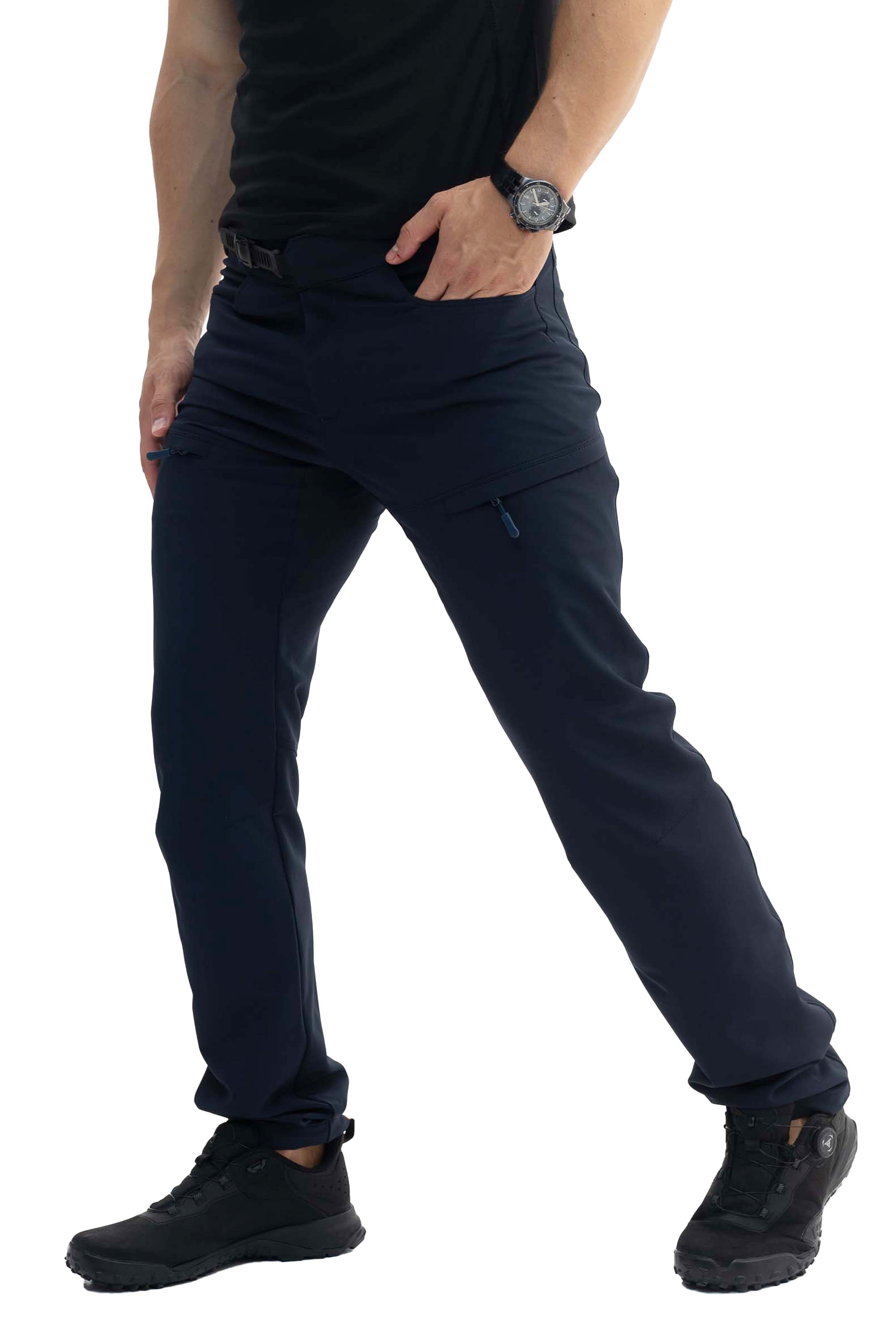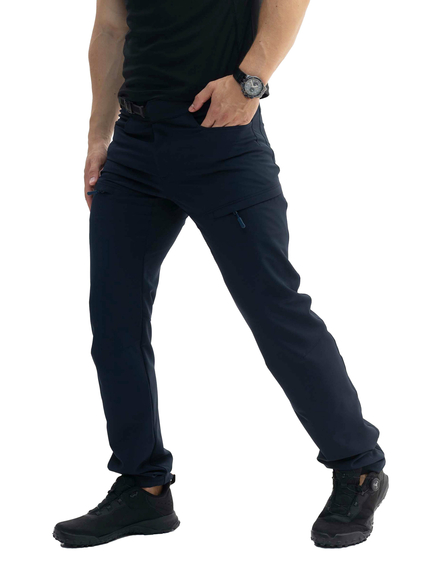 Модель має вшитий ремінь з регулюванням, що дозволяє зручно фіксувати посадку. Практичне рішення – 5 кишень: дві стандартні з боків, дві на стегнах на блискавках та одна задня кишеня на блискавці. Внизу штанин є регулювання об'єму, що особливо зручно для походів або активних дій.