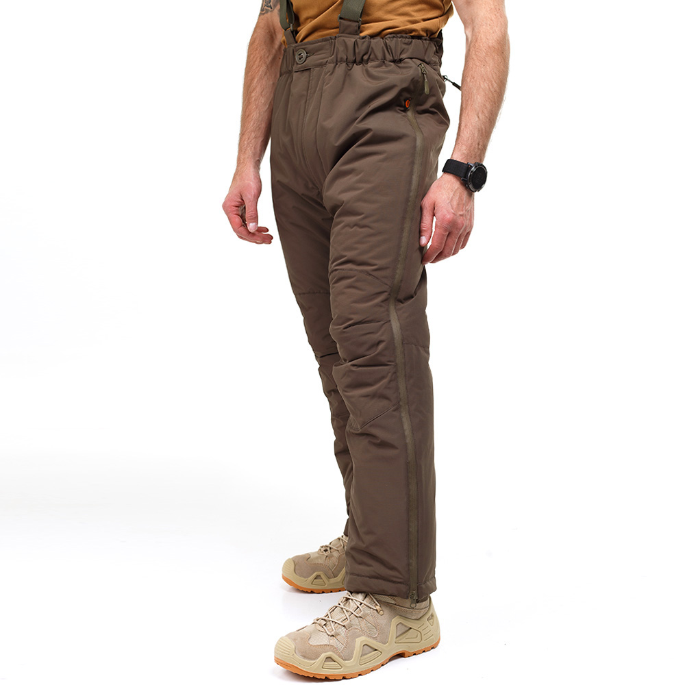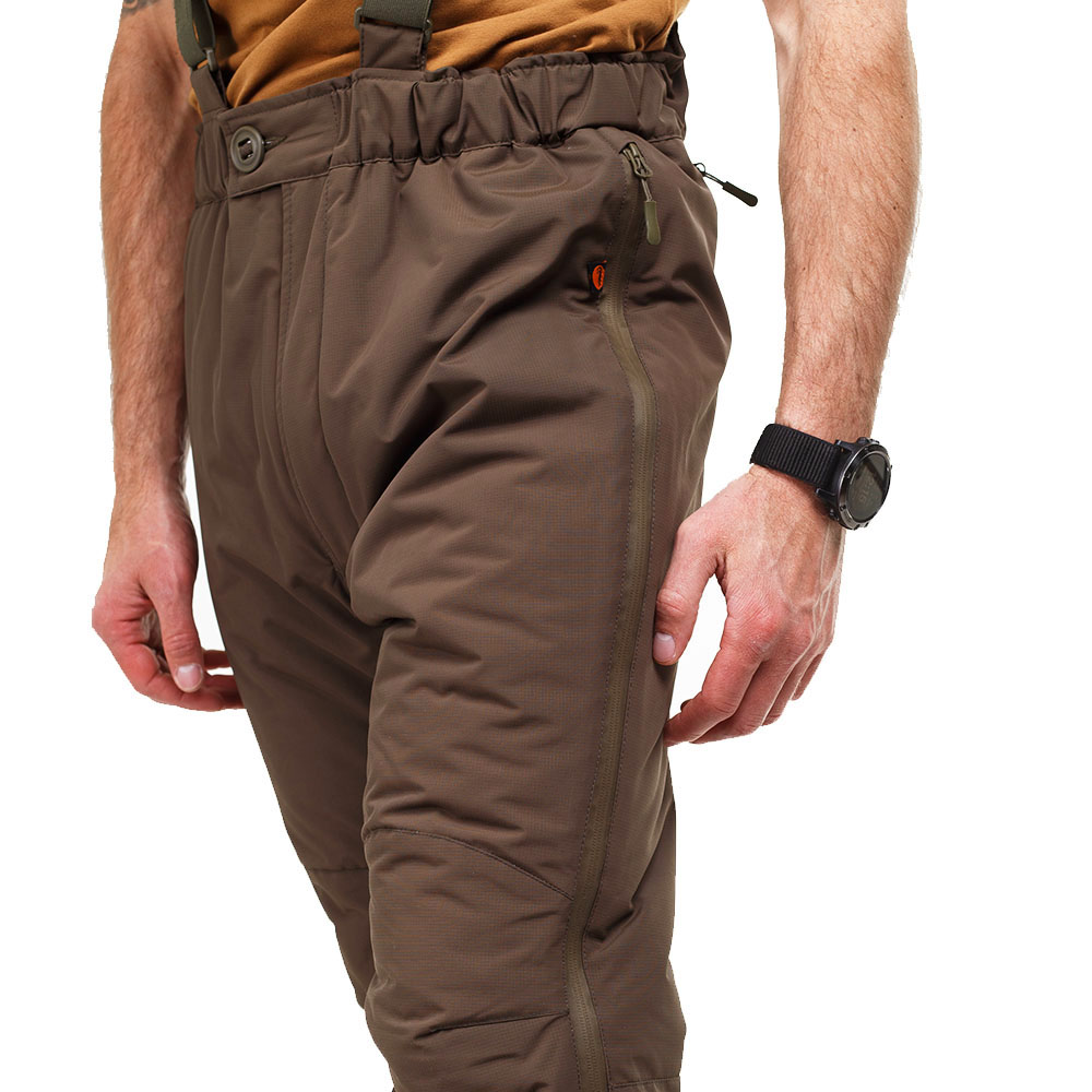 Верх штанів виготовлений із міцної, вологостійкої плащової мембранної тканини 100% NYLON 6.6 FD Cordura ripstop PU Milky Lamination (100% нейлон) щільністю 195 г/м2. Тканина зносостійка, міцна, стійка до стирання та розривів. Завдяки внутрішньому мембранному покриттю куртка має відмінну водонепроникність та гігроскопічність, відповідає ISO811 ≥ 10000 мм Н2О. Така тканина також перешкоджає проникненню вітру, що не продувається. Завдяки цій властивості знижуються втрати тепла з-під одягу, і частково створюється бар'єр зовнішнього високотемпературного впливу. Мембрана виводить зайве тепло та вологу назовні, підтримуючи мікроклімат усередині одягу, забезпечуючи додатковий комфорт. Підкладкова тканина 100% нейлон щільністю 36 г/м2.